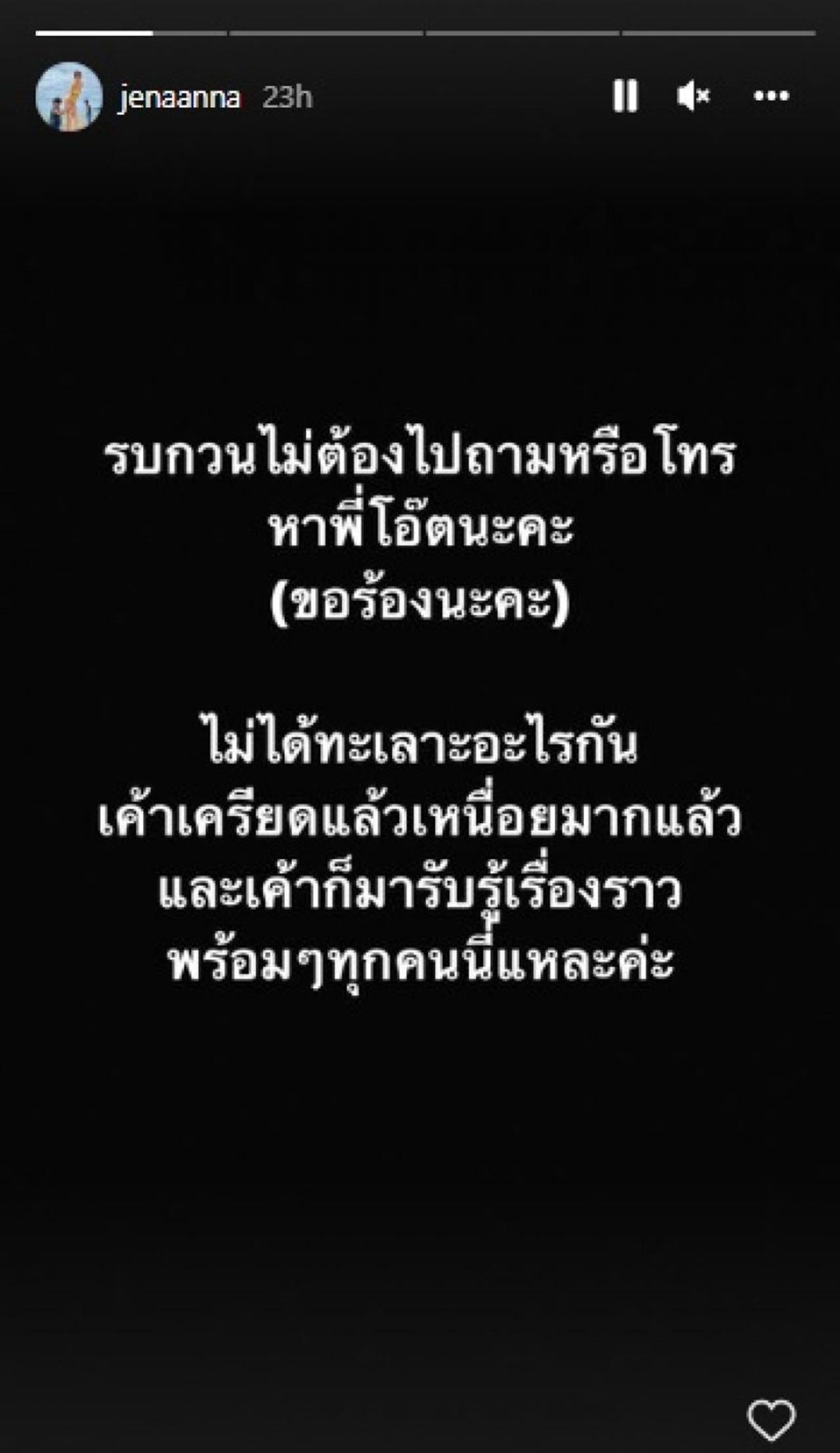 "รบกวนไม่ต้องไปถาม หรือโทรหาพี่โอ๊ตนะคะ (ขอร้องนะคะ)ไม่ได้ทะเลาะอะไรกัน เขาเครียด และเหนื่อยมากแล้ว และเค้าก็มารับรู้เรื่องราว พร้อมๆ ทุกคนนี่แหละค่ะ".