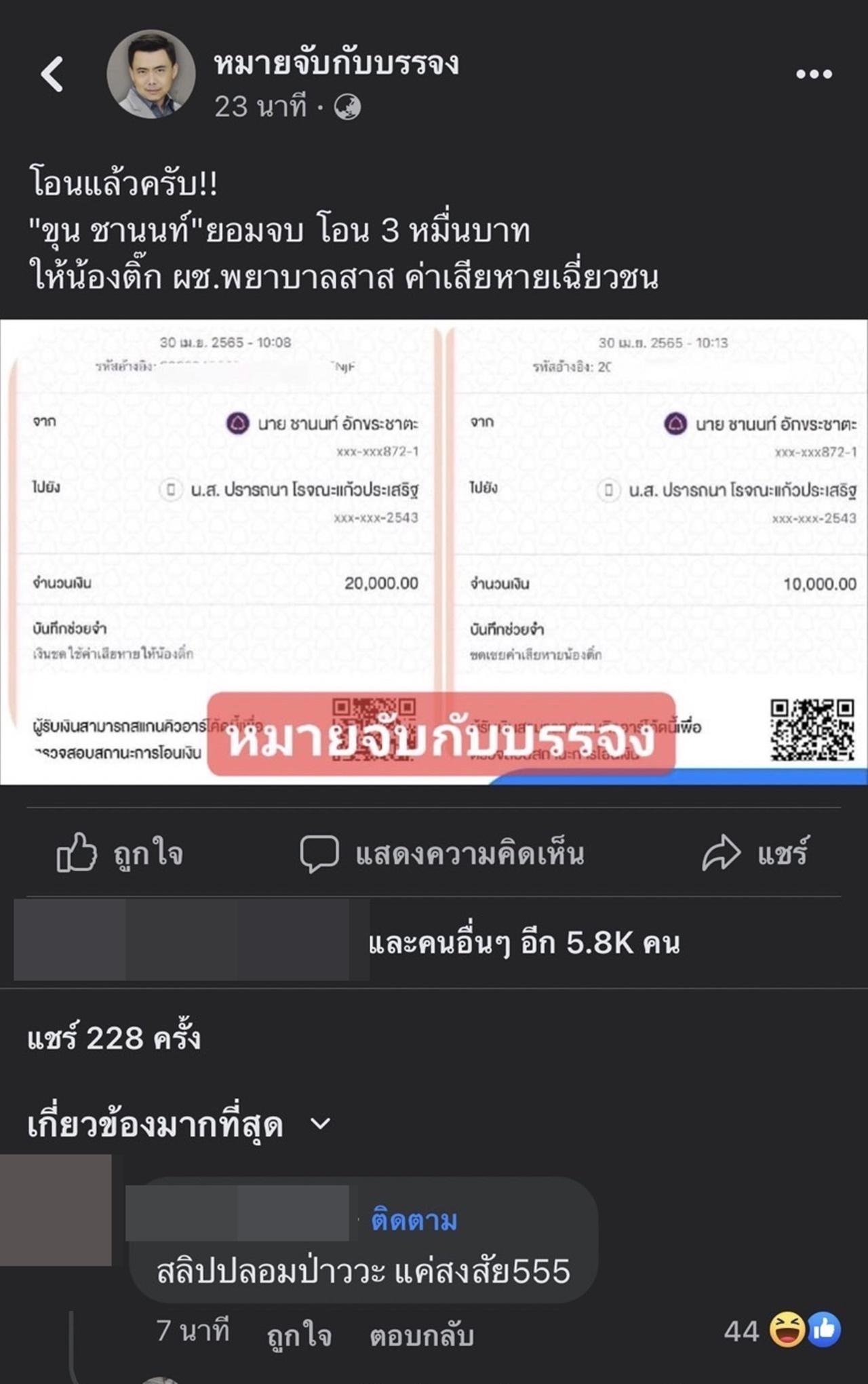 ล่าสุด เพจหมายจับกับบรรจง ก็ได้โพสต์ภาพสลิปการโอนเงินของนักแสดงหนุ่ม ขุน ชานนท์ ที่ได้โอนเงินให้กับผู้เสียหายเป็นจำนวนเงิน 3 หมื่นบาท พร้อมกับมีข้อความว่า "โอนแล้วครับ ขุน ชานนท์ ยอมจบ โอน 3 หมื่นบาทให้น้องติ๊ก ผช.พยาบาลสาว ค่าเสียหายเฉี่ยวชน"