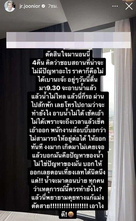 ด้าน จูเนียร์ กรวิชญ์ ก็โพสต์ข้อความในไอจีสตอรี่เช่นกัน โดยบอกว่า “ตัดสินใจมานอนนี่ 4 คืน คิดว่าชอบสถานที่ น่าจะไม่มีปัญหาอะไร ราคาก็คือไม่ได้เบานะจ๊ะ อยู่ๆ วันนี้ตื่นมา 9.30 จะอาบน้ำแล้ว แล้วน้ำไม่ไหล นี่ก็รอผ่านไปสักพักเลยโทรไปถามว่า จะทำยังไงอาบน้ำไม่ได้ เช็กเอาต์ไม่ได้ เพราะจะถึงเวลาแล้วเช็กเอาต์ออก