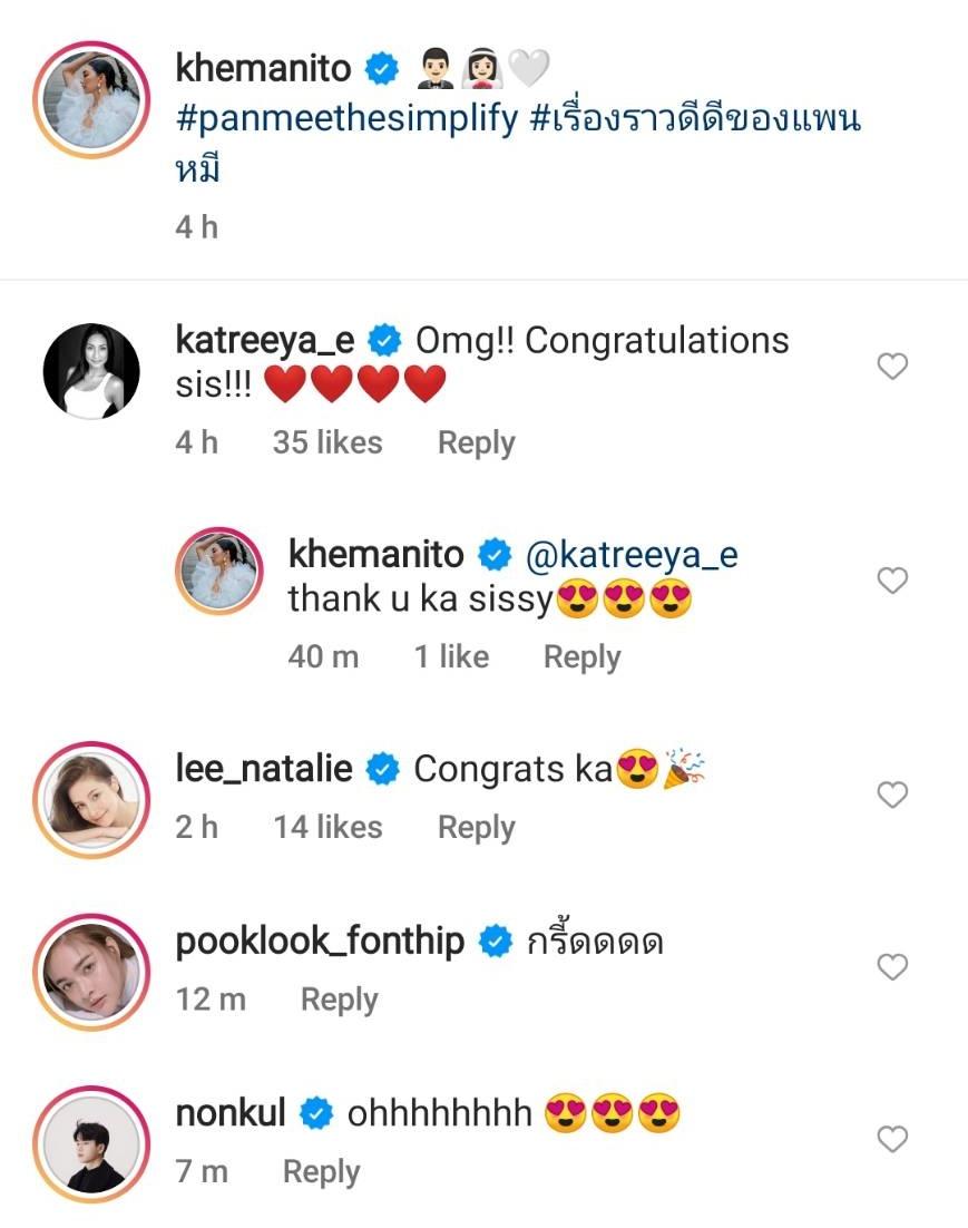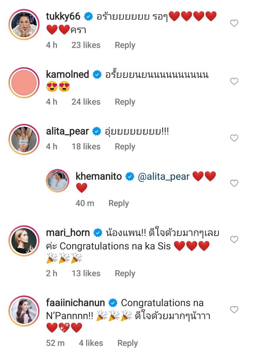 งานนี้แฟนๆ แห่คอมเมนต์แสดงความยินดี พร้อมทั้งส่งอีโมจิหัวใจเต็มไอจี ด้านคนในวงการบันเทิงต่างคอมเมนต์หลายคน อาทิ แคทรียา อิงลิช “Omg!! Congratulations sis!!!”, นาตาลี เจียรวนนท์ “Congrats ka”, ตุ๊กกี้ สุดารัตน์ “อร้ายยยยยย รอๆ คร่า”, ปุ๊กลุก ฝนทิพย์ "กรี๊ดดดด" ฯลฯ
