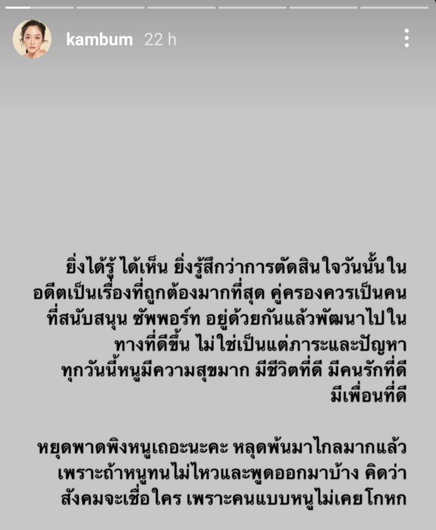 นอกจากนี้ในไอจีสตอรี่ของ แก้มบุ๋ม ปรียาดา ก็ได้โพสต์ภาพข้อความที่เขียนไว้ว่า “ยิ่งได้รู้ ได้เห็น ยิ่งรู้สึกว่าการตัดสินใจวันนั้นในอดีตเป็นเรื่องที่ถูกต้องมากที่สุด คู่ครองควรเป็นคนที่สนับสนุน ซัพพอร์ต อยู่ด้วยกันแล้วพัฒนาไปในทางที่ดีขึ้น ไม่ใช่เป็นแต่ภาระและปัญหา ทุกวันนี้หนูมีความสุขมาก มีชีวิตที่ดี มีคนรักที่ดี มีเพื่อนที่ดี หยุดพาดพิงหนูเถอะนะคะ หลุดพ้นมาไกลมากแล้ว เพราะถ้าหนูทนไม่ไหวและพูดออกมาบ้าง คิดว่าสังคมจะเชื่อใคร เพราะคนแบบหนูไม่เคยโกหก”