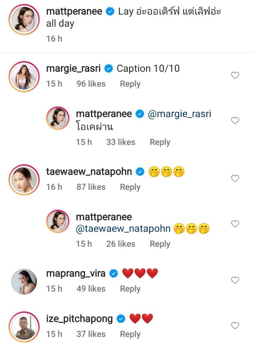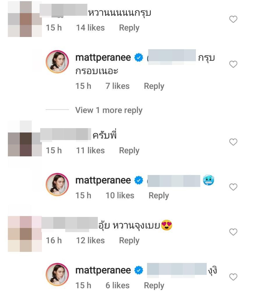 งานนี้ทำเอาเพื่อนๆ รวมถึงแฟนๆ แห่กดไลค์พร้อมทั้งแซวความหวานแบบรัวๆ อาทิ Caption 10/10, หวานนนนนกรุบ, อุ้ย หวานจุงเบย, หูยยยยยย รอรูปคู่มานานนนนนน เลิศปัง ลงบ่อยๆนะคะแมท เยิฟฟฟ, เหมือนนางเอกพระเอกซีรีส์อ่ะ เอาจริง, ความยิ้มกริ่มนั้นนนนน ฯลฯ
