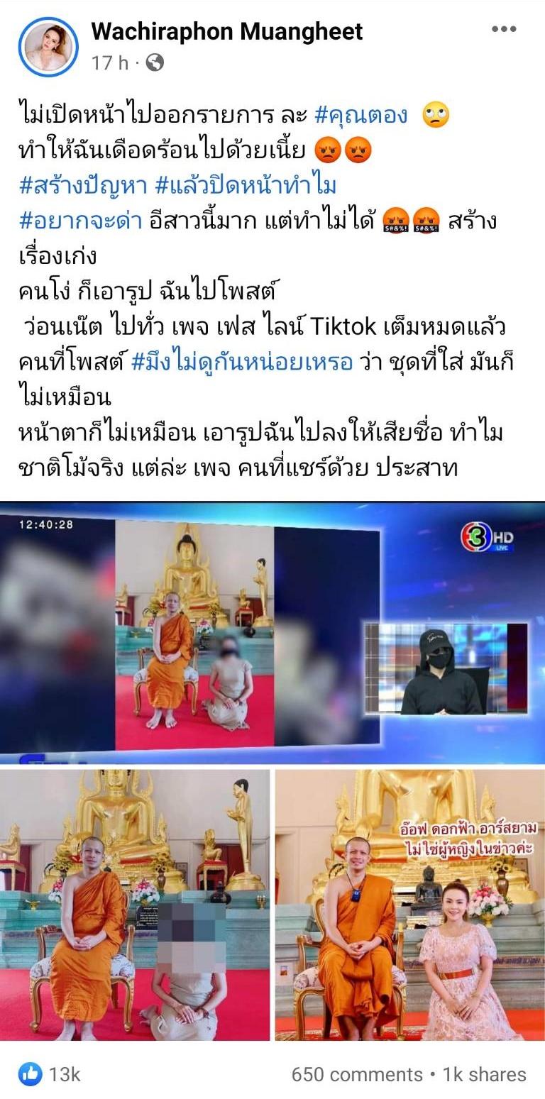 หลังจากนั้น อ๊อฟโพสต์ภาพของตองที่ไปออกรายการ “โหนกระแส” ทางช่อง 3 และเขียนข้อความว่า “ไม่เปิดหน้าไปออกรายการ ละ #คุณตอง ทำให้ฉันเดือดร้อนไปด้วยเนี้ย #สร้างปัญหา #แล้วปิดหน้าทำไม #อยากจะด่า อีสาวนี้มาก แต่ทำไม่ได้ สร้างเรื่องเก่ง คนโง่ ก็เอารูป ฉันไปโพสต์ ว่อนเน๊ต ไปทั่ว เพจ เฟส ไลน์ Tiktok เต็มหมดแล้ว คนที่โพสต์ #มึงไม่ดูกันหน่อยเหรอ ว่า ชุดที่ใส่ มันก็ไม่เหมือน หน้าตาก็ไม่เหมือน เอารูปฉันไปลงให้เสียชื่อ ทำไม ชาติโม้จริง แต่ล่ะ เพจ คนที่แชร์ด้วย ประสาท”