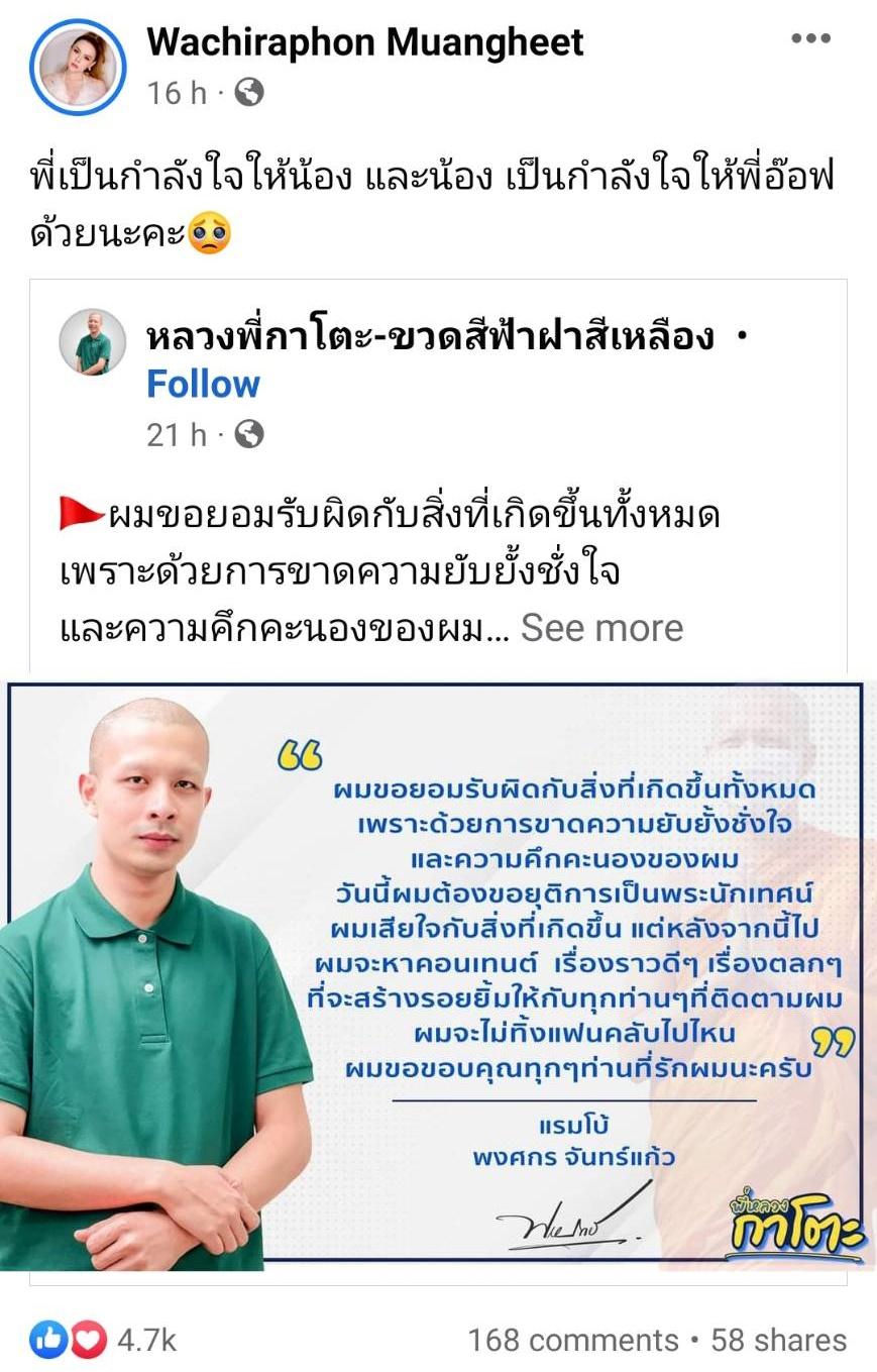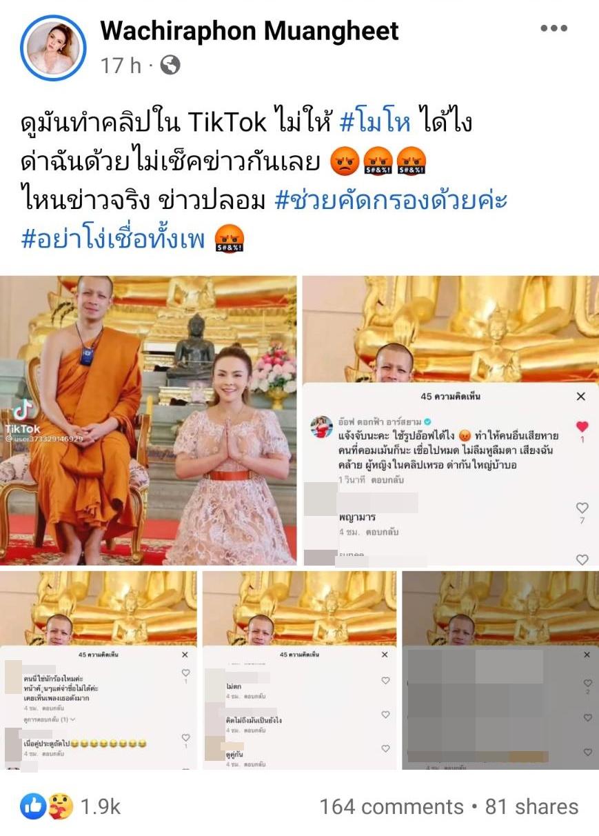 อีกทั้งยังโพสต์คลิปจาก TikTok และเขียนข้อความว่า “ดูมันทำคลิปใน TikTok ไม่ให้ #โมโห ได้ไง ด่าฉันด้วยไม่เช็คข่าวกันเลย ไหนข่าวจริง ข่าวปลอม #ช่วยคัดกรองด้วยค่ะ #อย่าโง่เชื่อทั้งเพ”.