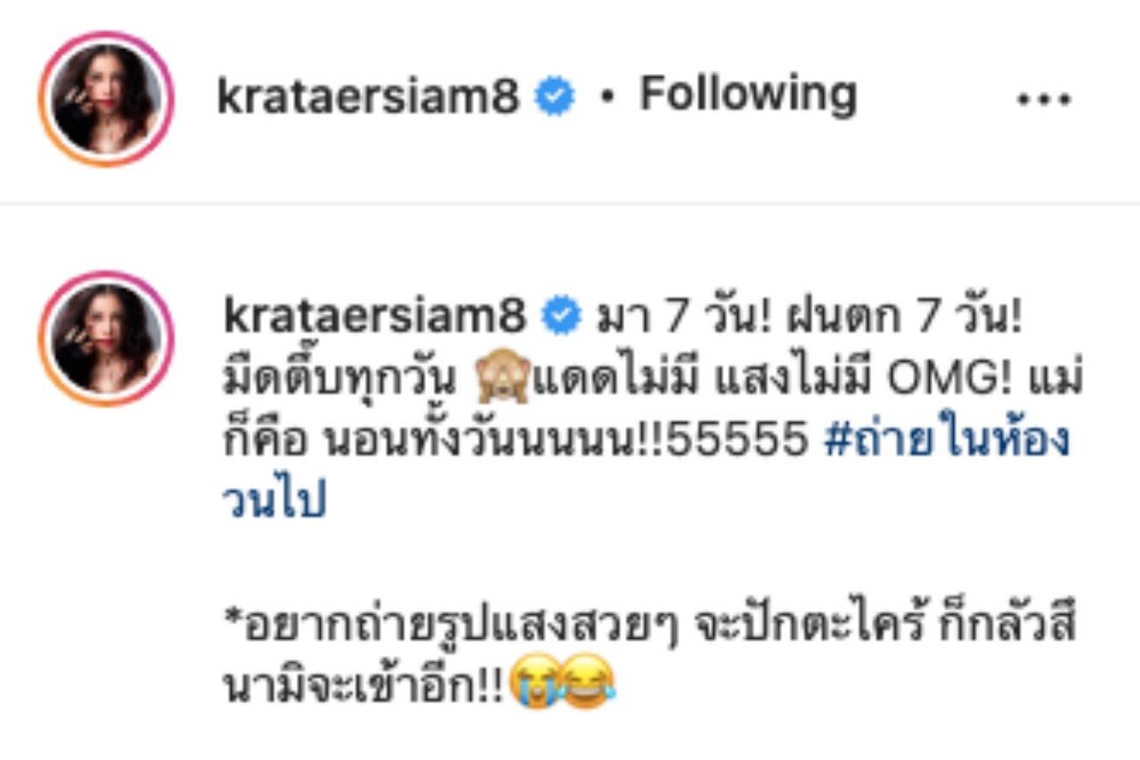 กระแต อาร์สยาม ไปเที่ยวภูเก็ตก็ไม่พลาดมีภาพฉ่ำปอดมาให้แฟนๆ ได้ชมกับเซตภาพถ่ายในชุดบิกินีรัวๆ แม้ไปคราวนี้อากาศจะไม่เป็นใจจนเจ้าตัวต้องโพสต์แซวตัวเอง "มา 7 วัน! ฝนตก 7 วัน! มืดตึ๊บทุกวัน แดดไม่มี แสงไม่มี OMG! แม่ก็คือ นอนทั้งวันนนนน!!55555 #ถ่ายในห้องวนไป *อยากถ่ายรูปแสงสวยๆ จะปักตะไคร้ ก็กลัวสึนามิจะเข้าอีก!!"