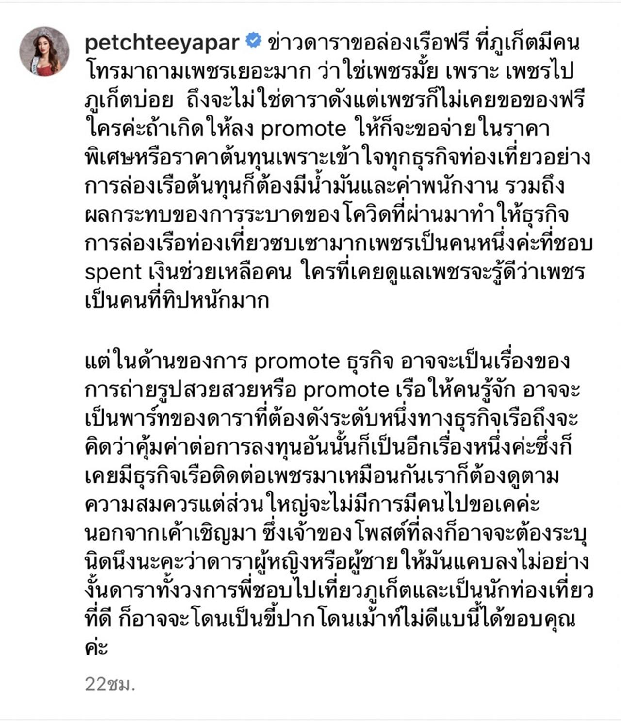 "ข่าวดาราขอล่องเรือฟรี ที่ภูเก็ตมีคนโทรมาถามเพชรเยอะมาก ว่าใช่เพชรมั้ย เพราะ เพชรไปภูเก็ตบ่อย ถึงจะไม่ใช่ดาราดัง แต่เพชรก็ไม่เคยขอของฟรีใครค่ะ ถ้าเกิดให้ลง promote ให้ ก็จะขอจ่ายในราคาพิเศษหรือราคาต้นทุน