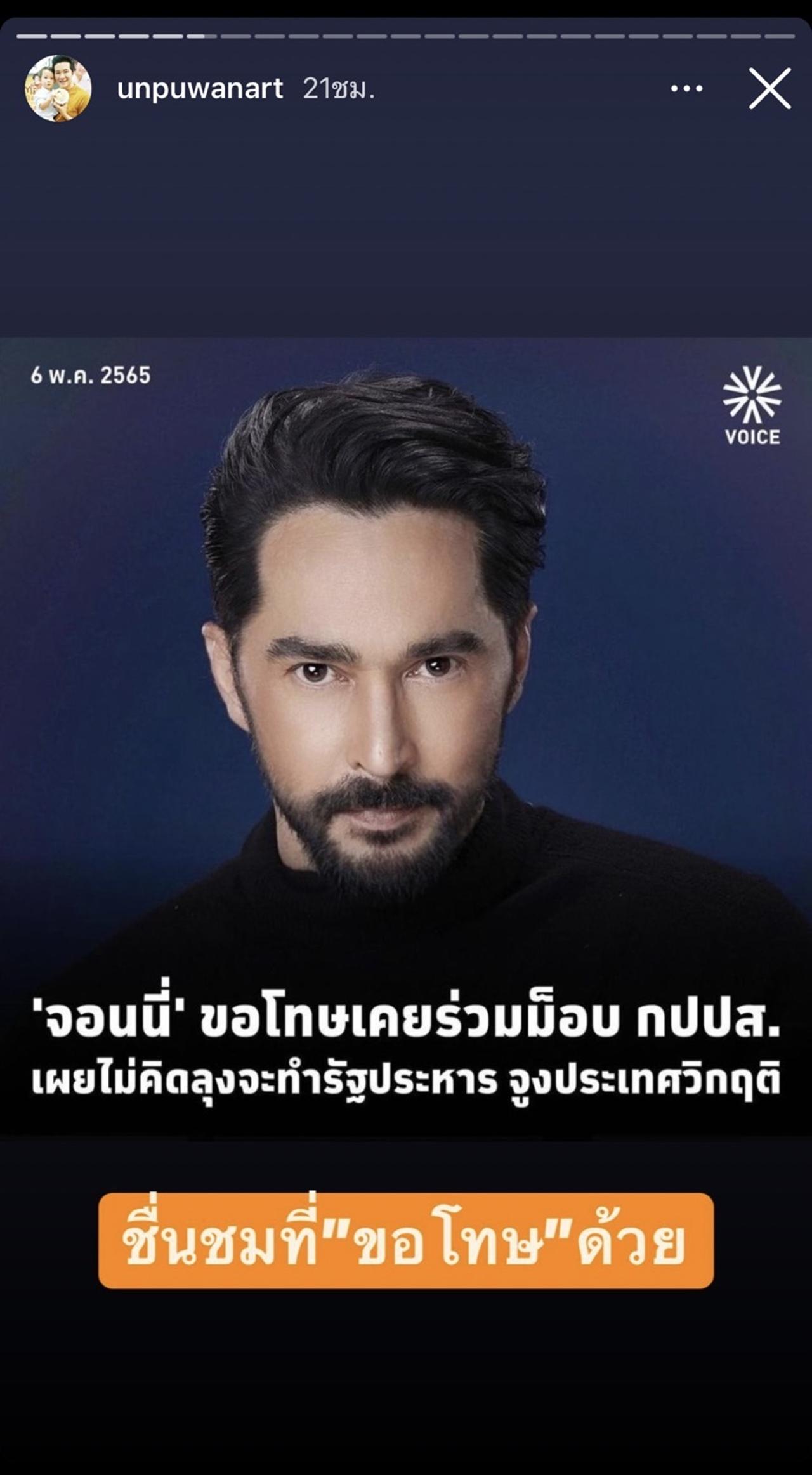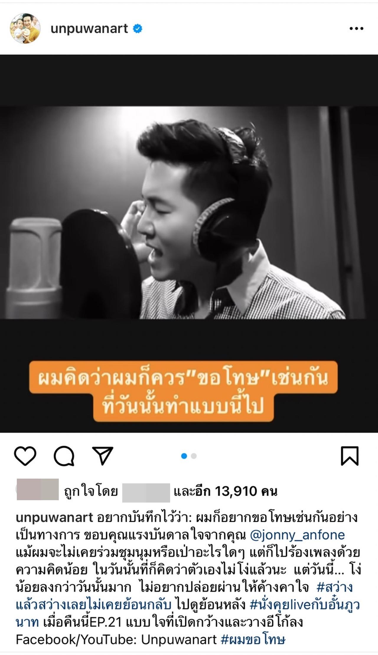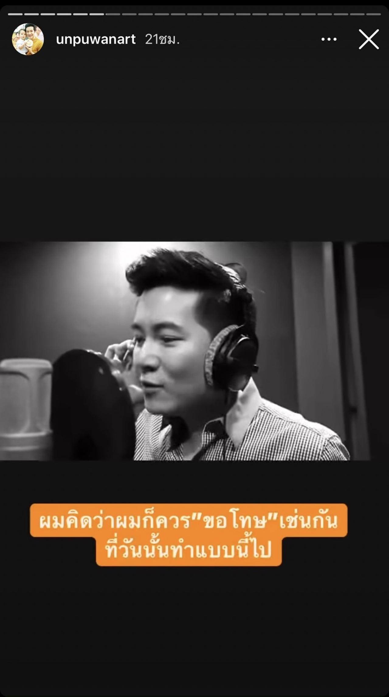 "อยากบันทึกไว้ว่า: ผมก็อยากขอโทษเช่นกันอย่างเป็นทางการ ขอบคุณแรงบันดาลใจจากคุณ @jonny_anfone แม้ผมจะไม่เคยร่วมชุมนุมหรือเป่าอะไรใดๆ แต่ก็ไปร้องเพลงด้วยความคิดน้อย ในวันนั้นที่ก็คิดว่าตัวเองไม่โง่แล้วนะ แต่วันนี้… โง่น้อยลงกว่าวันนั้นมาก ไม่อยากปล่อยผ่านให้ค้างคาใจ #สว่างแล้วสว่างเลยไม่เคยย้อนกลับ #ผมขอโทษ".