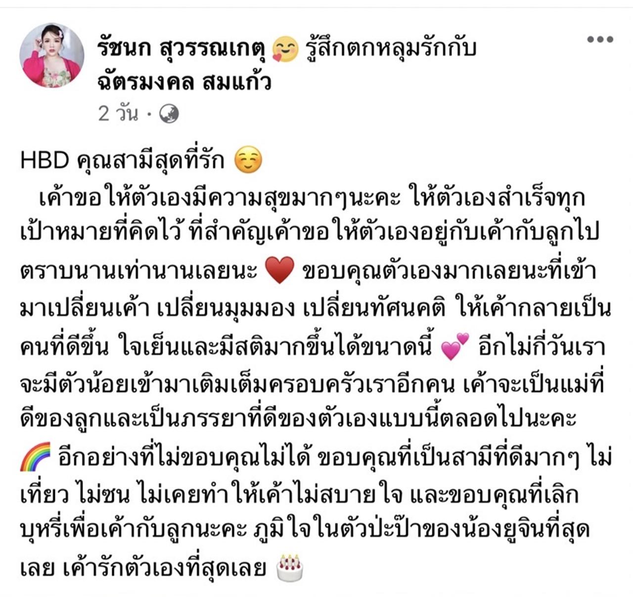 "HBD คุณสามีสุดที่รัก เค้าขอให้ตัวเองมีความสุขมากๆนะคะ ให้ตัวเองสำเร็จทุกเป้าหมายที่คิดไว้ ที่สำคัญเค้าขอให้ตัวเองอยู่กับเค้ากับลูกไปตราบนานเท่านานเลยนะ ขอบคุณตัวเองมากเลยนะที่เข้ามาเปลี่ยนเค้า เปลี่ยนมุมมอง เปลี่ยนทัศนคติ ให้เค้ากลายเป็นคนที่ดีขึ้น ใจเย็นและมีสติมากขึ้นได้ขนาดนี้