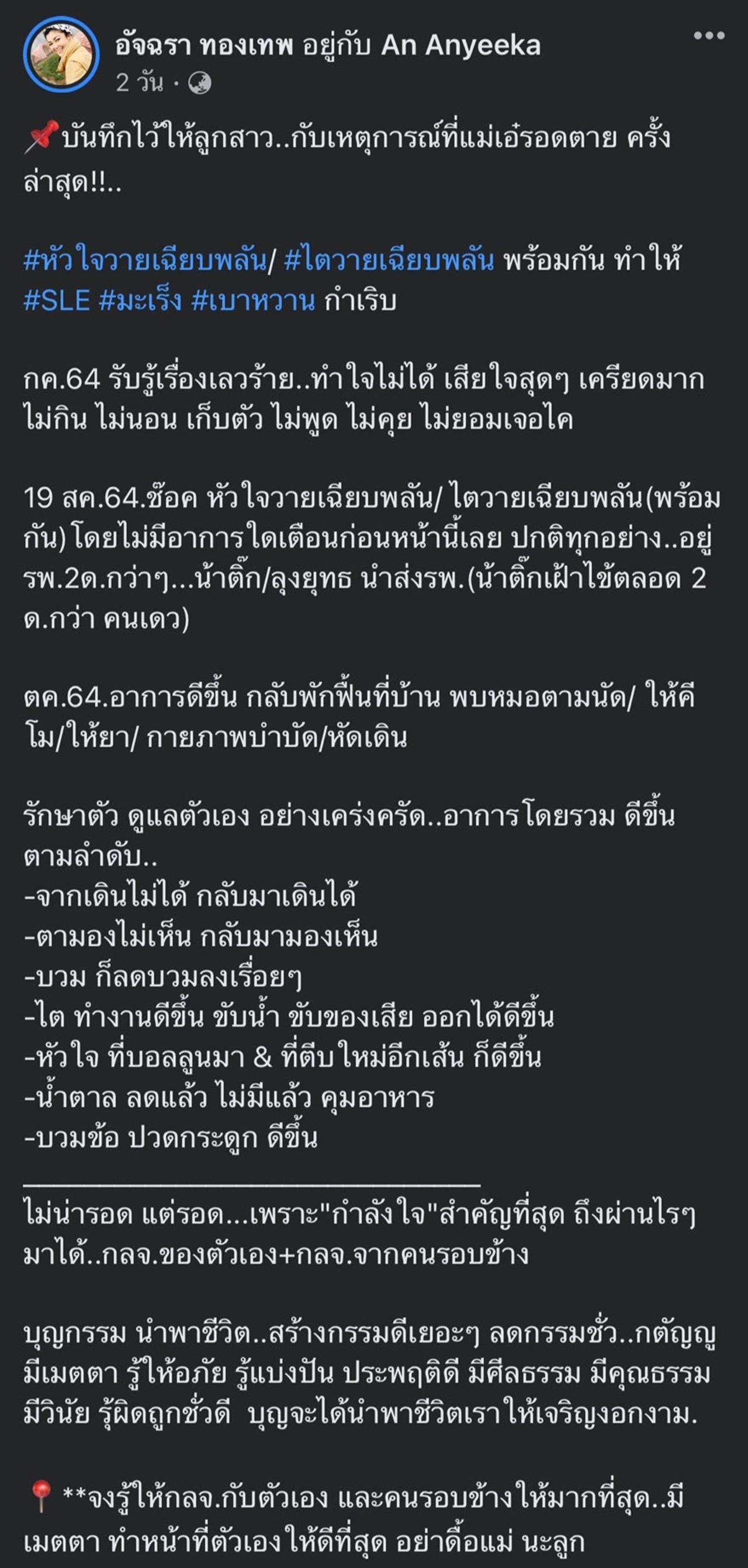 เรียกว่าเป็นอีกหนึ่งคนที่ได้ผ่านเหตุการณ์เฉียดตายมา สำหรับ อดีตนางเอกดัง เอ๋ อัจฉรา ทองเทพ ที่ล่าสุดเจ้าตัวได้โพสต์ภาพ พร้อมบอกเล่าเรื่องราวอาการเจ็บป่วยของตัวเอง ผ่านเฟซบุ๊กส่วนตัวไว้ว่า