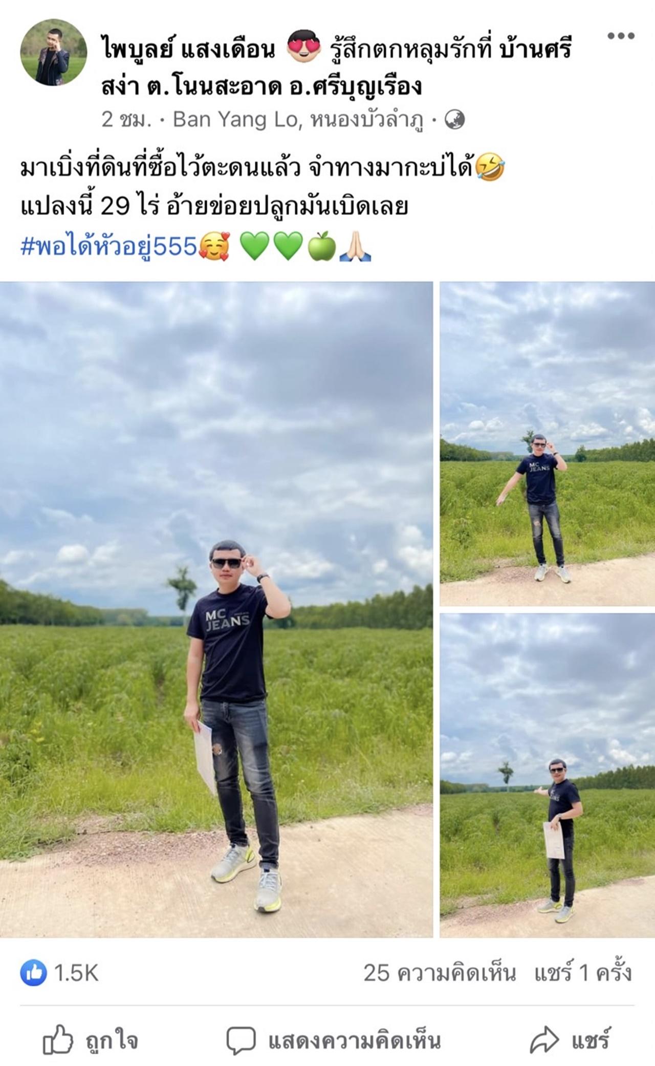 ล่าสุดในเฟซบุ๊ก ไพบูลย์ แสงเดือน เจ้าตัวก็ได้เคลื่อนไหวหลังมีเรื่องที่ถูกอัยการสั่งฟ้อง ซึ่งเป็นภาพตัวเองกับที่ดินผืนใหญ่ที่ บ้านศรีสง่า ต.โนนสะอาด อ.ศรีบุญเรือง จ.หนองบัวลำภู พร้อมระบุข้อความว่า “มาเบิ่งที่ดินที่ซื้อไว้ตะดนแล้ว จำทางมากะบ่ได้ แปลงนี้ 29 ไร่ อ้ายข่อยปลูกมันเบิดเลย #พอได้หัวอยู่555”