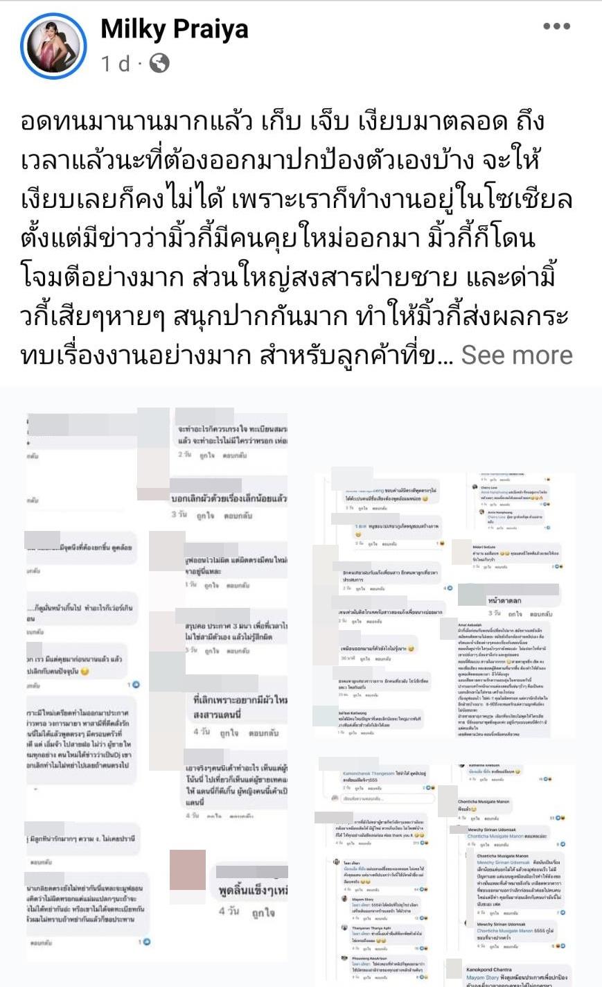 ก่อนจะโพสต์ภาพแคปคอมเมนต์ชาวเน็ตที่เข้ามาด่าลงในเฟซบุ๊กส่วนตัว และบอกว่าตั้งแต่มีข่าวว่ามีคนคุยใหม่ก็โดนโจมตีอย่างหนัก ส่วนใหญ่สงสารฝ่ายชายและด่ามิ้วกี้เสียหาย ส่งผลกระทบกับเรื่องงานอย่างมาก ก่อนจะยืนยันอีกครั้งว่าตนไม่ได้คบซ้อนและมีชู้ พร้อมทั้งวอนให้แดนนี่ออกมาพูดความจริงบ้าง อย่าปล่อยให้เจ้าตัวเป็นคนผิดของแฟนๆ อีกฝ่ายและอีกหลายคนที่ไม่รู้ความจริงอีกเลย