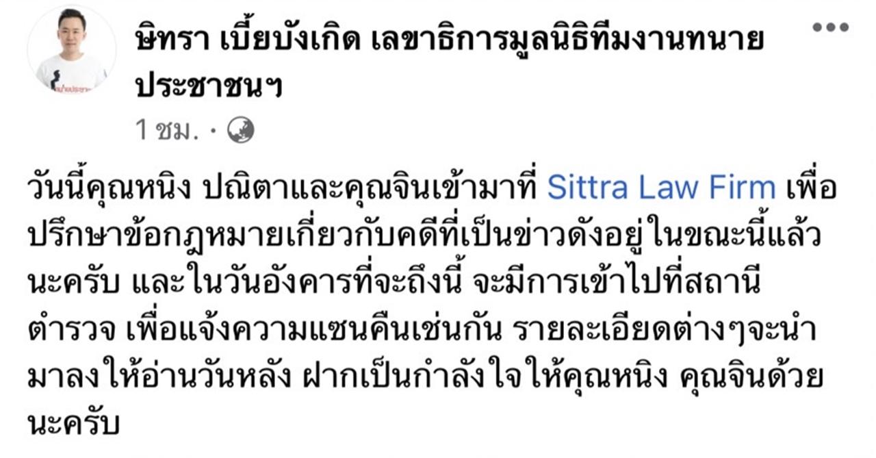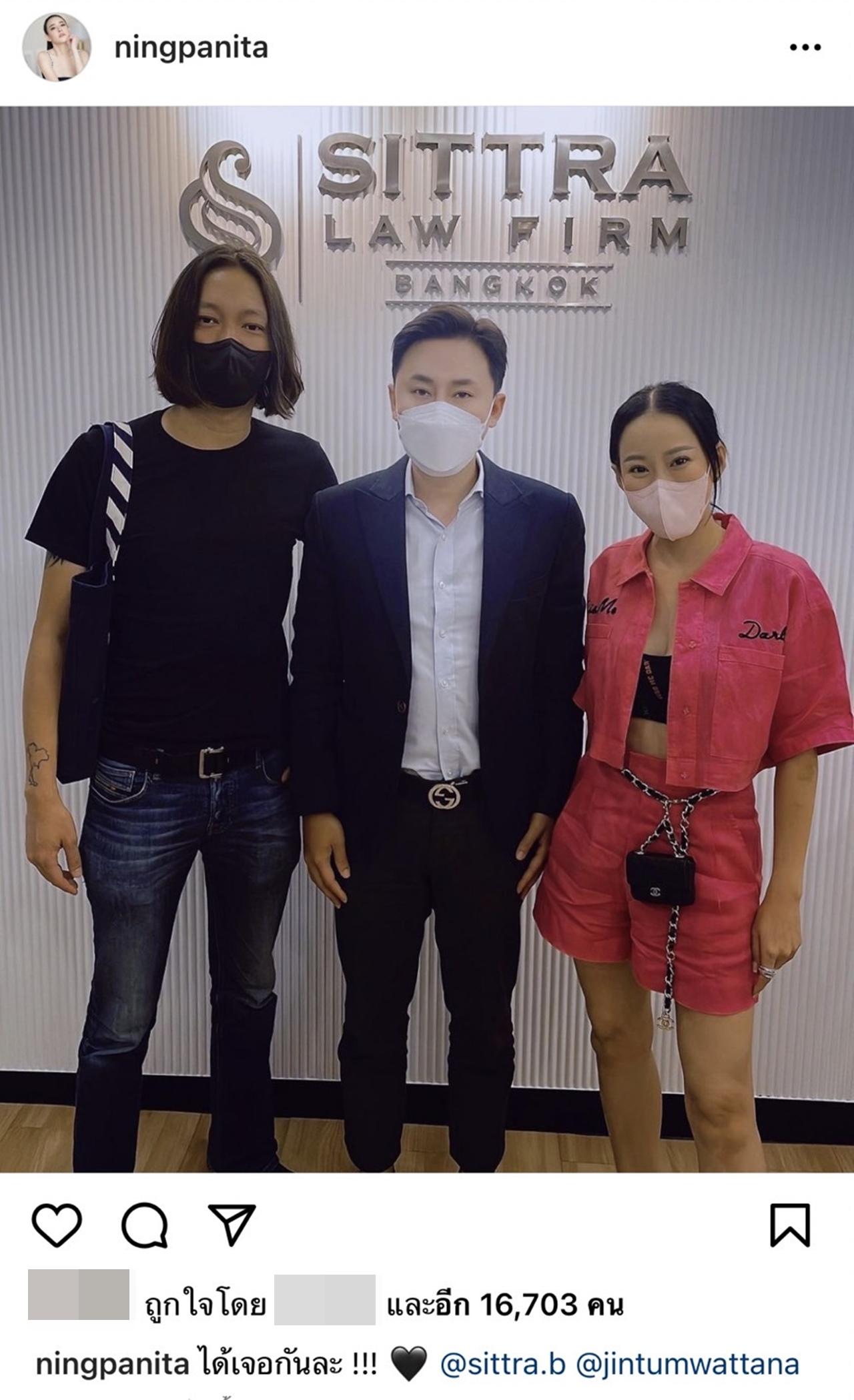 "วันนี้คุณหนิง ปณิตาและคุณจินเข้ามา เพื่อปรึกษาข้อกฎหมายเกี่ยวกับคดีที่เป็นข่าวดังอยู่ในขณะนี้แล้วนะครับ และในวันอังคารที่จะถึงนี้ จะมีการเข้าไปที่สถานีตำรวจ เพื่อแจ้งความแซนคืนเช่นกัน รายละเอียดต่างๆ จะนำมาลงให้อ่านวันหลัง ฝากเป็นกำลังใจให้คุณหนิง คุณจินด้วยนะครับ"