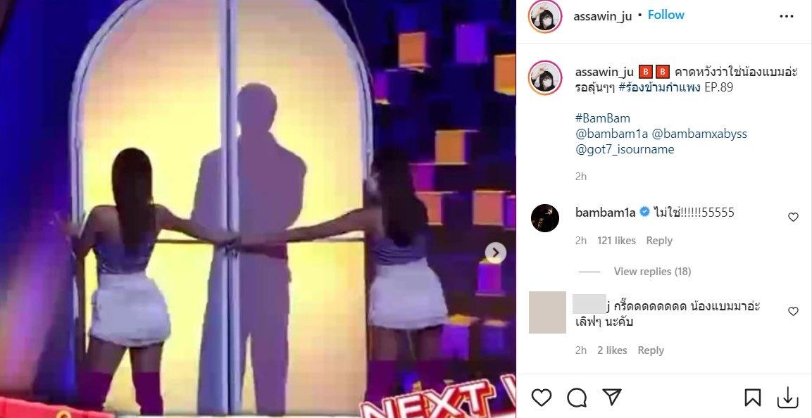 และที่ทำเอาแฟนๆ ฮือฮาก็ตอนที่มีแฟนคลับรายหนึ่งโพสต์ภาพเงาของนักร้องหลังกำแพงคู่ของดีเจนุ้ยลงในไอจีส่วนตัว พร้อมทั้งแท็กไปที่ไอจีของแบมแบม และเขียนข้อความว่า “คาดหวังว่าใช่น้องแบมอ่ะ รอลุ้นๆๆๆ #ร้องข้ามกำแพง EP.89” แต่งานนี้แบมแบมก็รีบเข้าไปคอมเมนต์ตอบกลับแบบชัดๆ ว่า “ไม่ใช่ !!!!!! 55555”