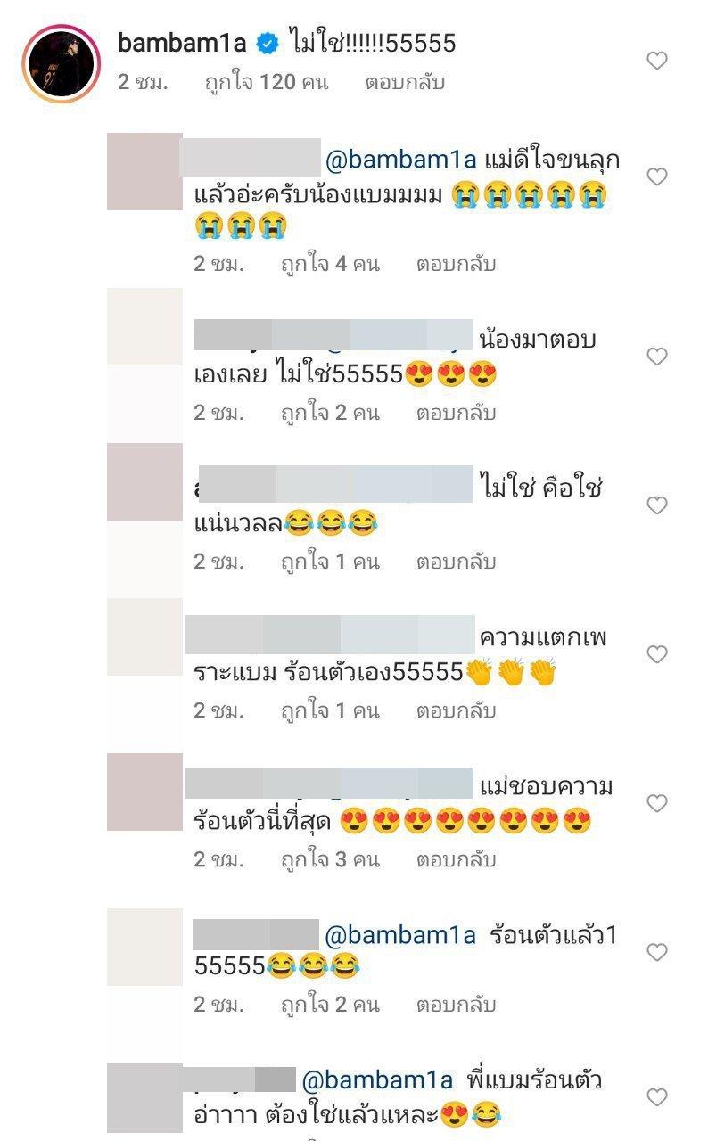 แต่งานนี้หลายคนไม่เชื่อและยิ่งสงสัยว่ามาตอบแบบนี้ดูมีพิรุธกว่าเดิมซะอีก อีกทั้งต้องเก็บความลับไว้ก่อนที่รายการจะออนแอร์ ทั้งนี้ก็ต้องไปรอดูกันอีกทีว่าสรุปแล้วจะใช่แบมแบมหรือไม่ในรายการละกันนะจ๊ะ.