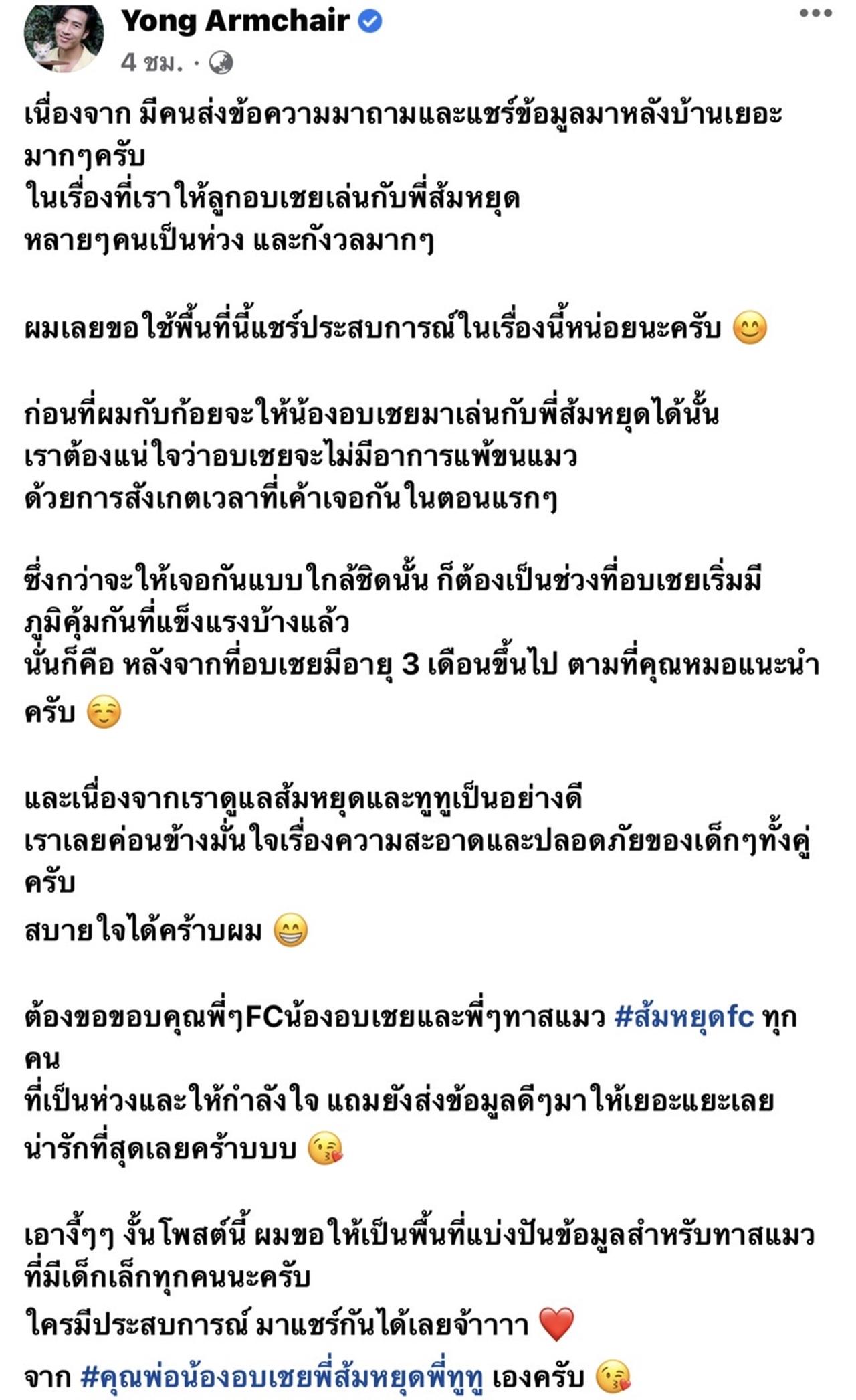 เปิดรับทุกความห่วงใยพร้อมรับฟังทุกข้อความที่ส่งมาถามถึง คุณพ่อโย่ง อาร์มแชร์ ว่าทำไมถึงปล่อยให้ลูกสาวสุดที่รัก น้องอบเชย เล่นกับ พี่ส้มหยุด แมวอันเป็นที่รัก งานนี้ คุณพ่อโย่ง ก็ได้ใช้พื้นที่ในเพจ yong armchair แชร์ประสบการณ์ในเรื่องนี้ไว้ว่า