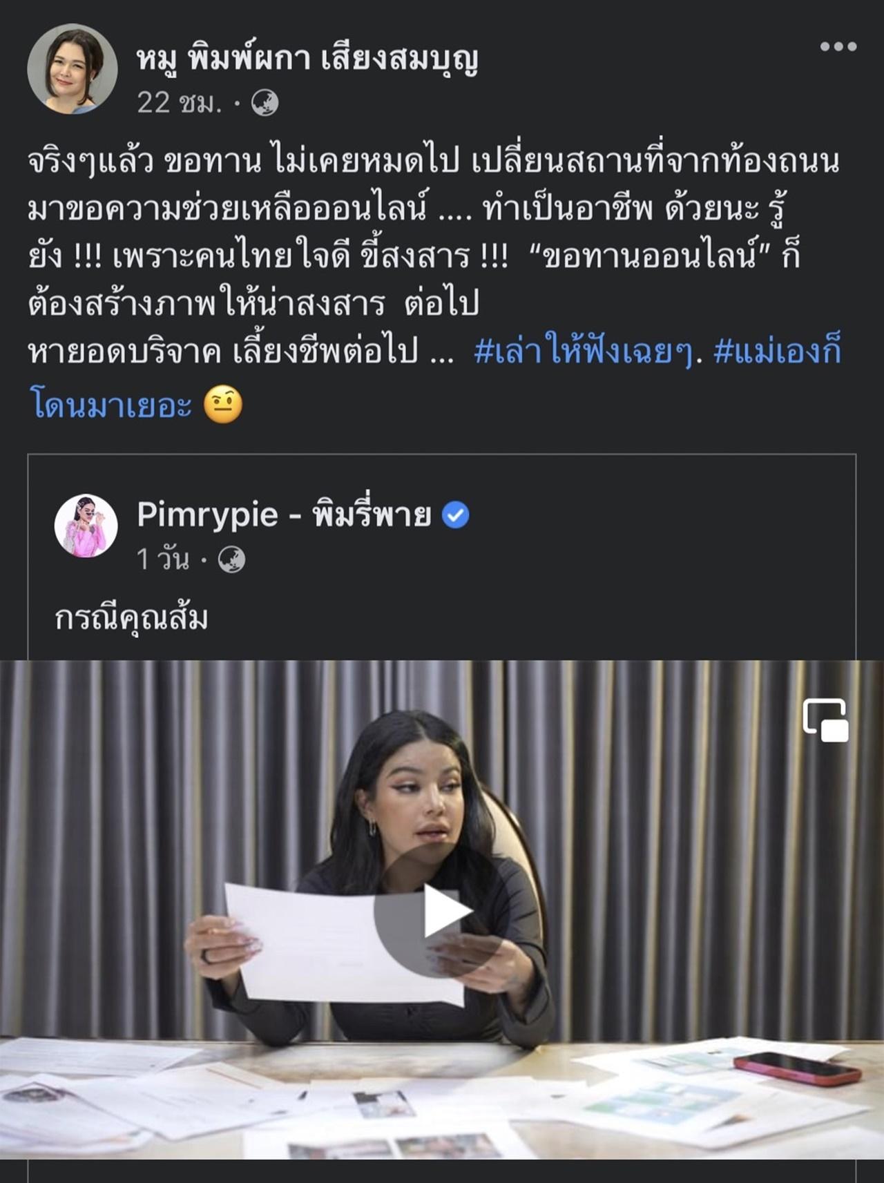ซึ่งงานนี้ พิมรี่พาย ไม่นิ่งเฉยจากดราม่าเรื่องดังกล่าว จนต้องมาไลฟ์ชี้แจงข้อเท็จจริงดังกล่าวผ่านช่องทางของตัวเอง