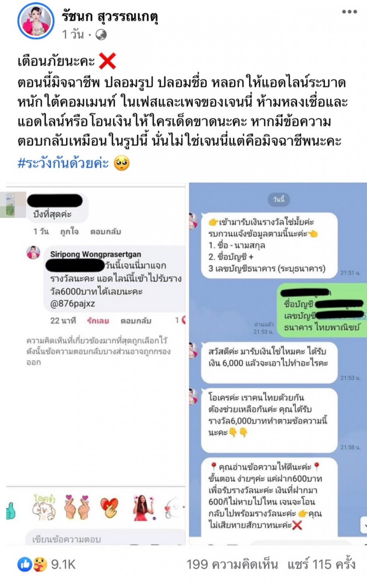 ทำเอานักร้องสาว เจนนี่ ได้หมดถ้าสดชื่น หรือ รัชนก สุวรรณเกตุ ต้องออกมาโพสต์เตือนแฟนๆ ของตัวเอง เพราะมีแฟนคลับบางคนได้ส่งภาพข้อความที่มีมิจฉาชีพสวมรอยโดยการใช้รูปของเจนนี่ส่งไลน์แอบอ้างให้โอนเงินให้