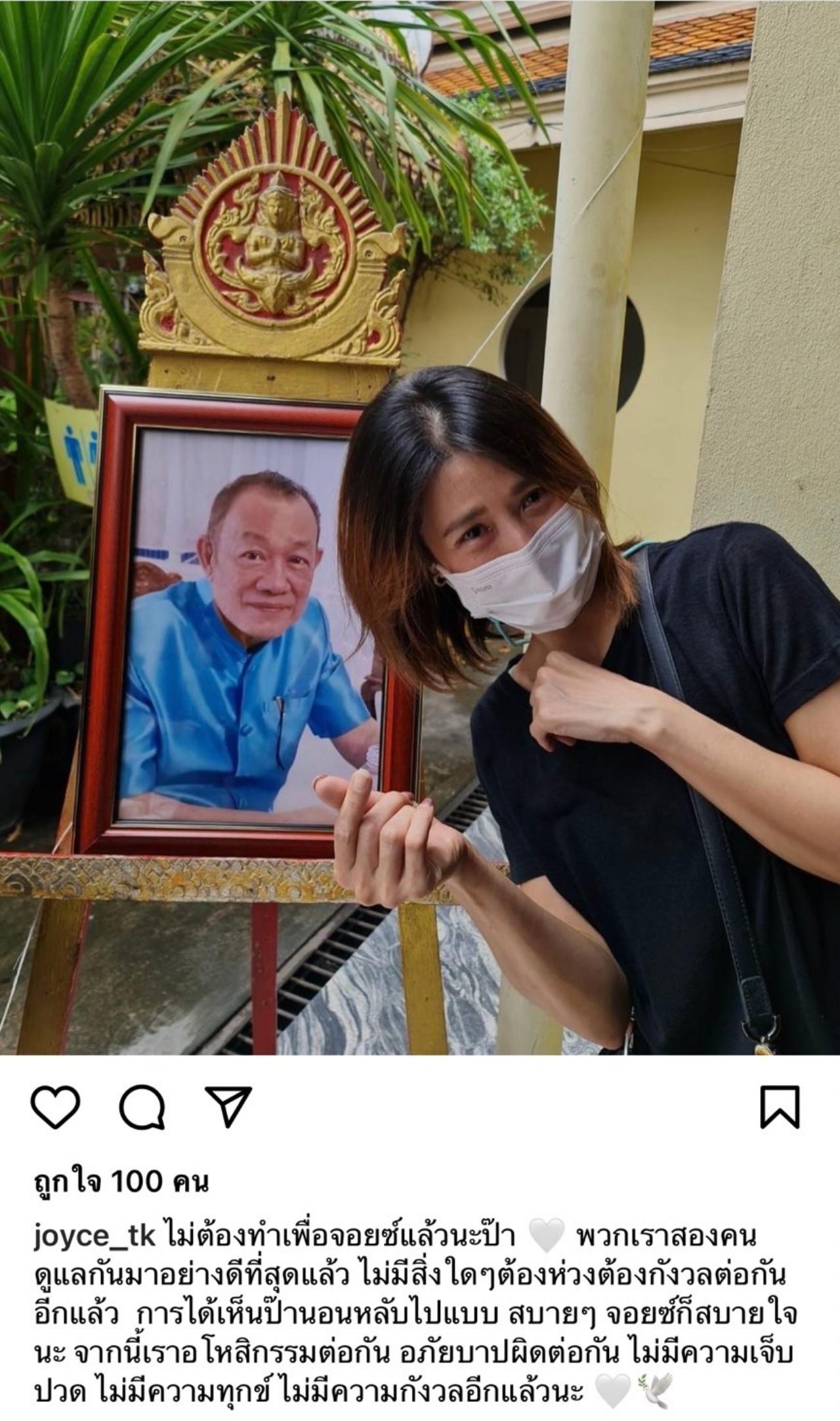 "ไม่ต้องทำเพื่อจอยซ์แล้วนะป๊า พวกเราสองคนดูแลกันมาอย่างดีที่สุดแล้ว ไม่มีสิ่งใดๆ ต้องห่วงต้องกังวลต่อกันอีกแล้ว การได้เห็นป๊านอนหลับไปแบบ สบายๆ จอยซ์ก็สบายใจนะ จากนี้เราอโหสิกรรมต่อกัน อภัยบาปผิดต่อกัน ไม่มีความเจ็บปวด ไม่มีความทุกข์ ไม่มีความกังวลอีกแล้วนะ" บันเทิงไทยรัฐออนไลน์ขอแสดงความเสียใจกับ จอยซ์ TK ด้วยนะคะ