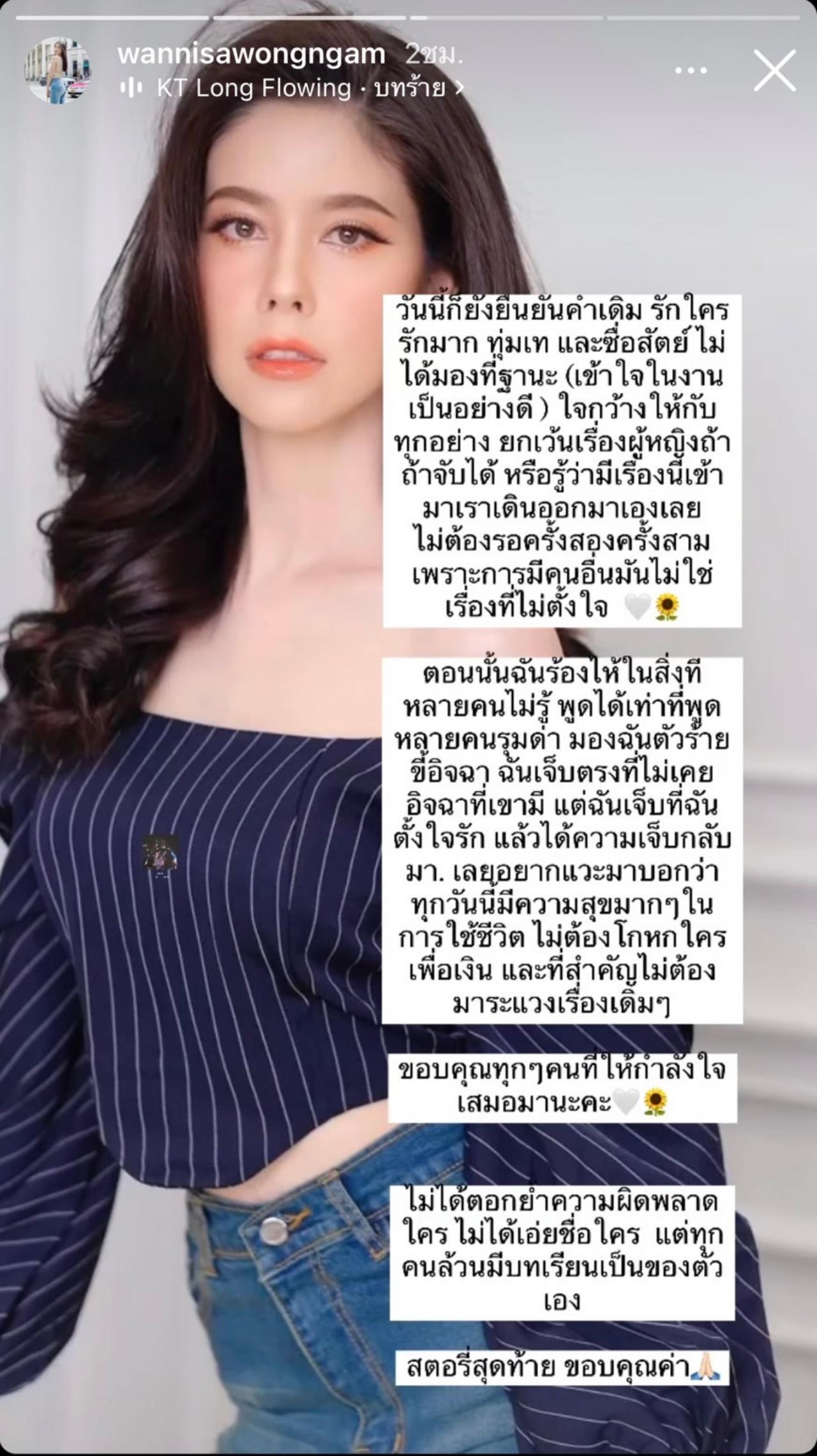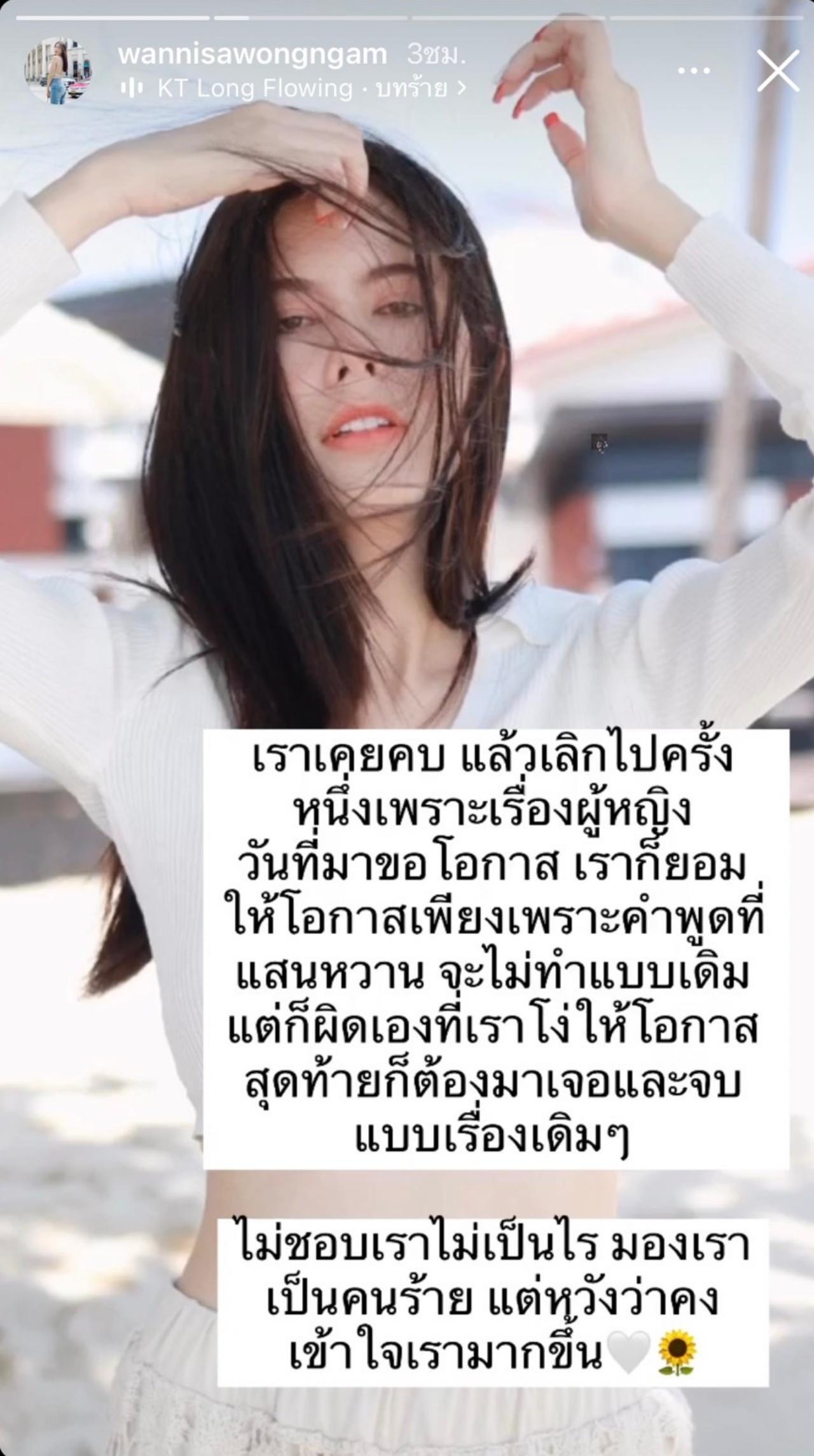 นอกจากนี้ แอนนา ยังได้โพสต์ไอจีสตอรี่ต่ออีกว่า "เราเคยคบแล้วเลิกไปครั้งหนึ่งเพราะเรื่องผู้หญิง วันที่มาขอโอกาส เราก็ยอมให้โอกาสเพียงเพราะคำพูดที่แสนหวาน จะไม่ทำแบบเดิมแต่ก็ผิดเองที่เราโง่ให้โอกาส สุดท้ายก็ต้องมาเจอและจบแบบเรื่องเดิมๆ ไม่ชอบเราไม่เป็นไร มองเราเป็นคนร้าย แต่หวังว่าคงเข้าใจเรามากขึ้น"