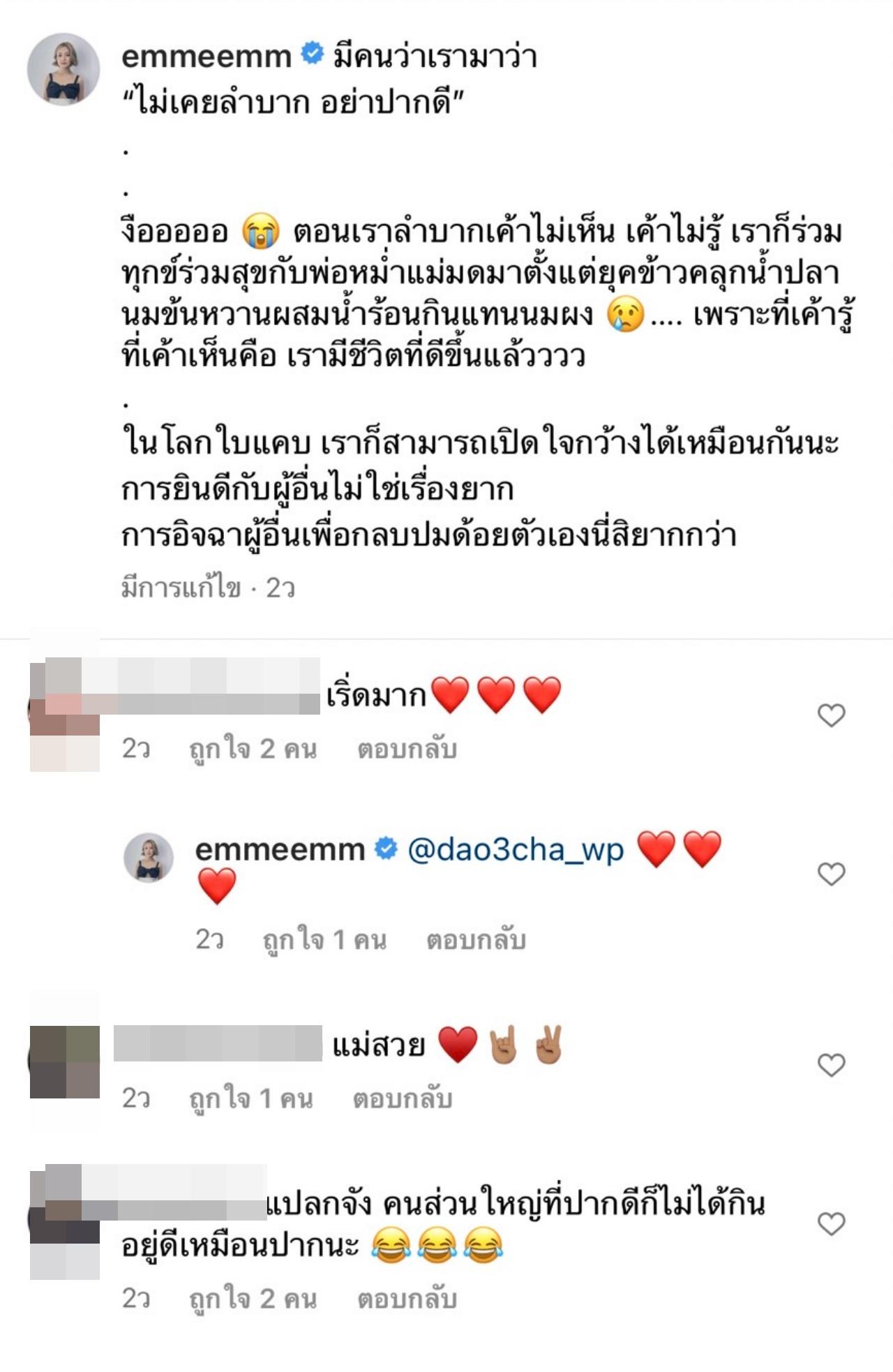 เพราะที่เค้ารู้ ที่เค้าเห็นคือ เรามีชีวิตที่ดีขึ้นแล้วววว ในโลกใบแคบ เราก็สามารถเปิดใจกว้างได้เหมือนกันนะการยินดีกับผู้อื่นไม่ใช่เรื่องยาก การอิจฉาผู้อื่นเพื่อกลบปมด้อยตัวเองนี่สิยากกว่า" หลังจากที่ เอ็ม บุษราคัม โพสต์ข้อความดังกล่าวไป ก็มีแฟนๆ เข้ามาคอมเมนต์ให้กำลังใจสาวเอ็มมากมาย
