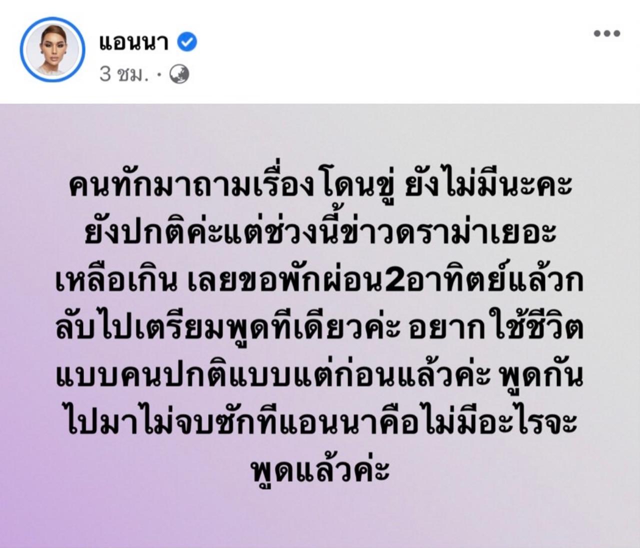 "คนทักมาถามเรื่องโดนขู่ ยังไม่มีนะคะ ยังปกติค่ะแต่ช่วงนี้ข่าวดราม่าเยอะเหลือเกิน เลยขอพักผ่อน2อาทิตย์แล้วกลับไปเตรียมพูดทีเดียวค่ะ อยากใช้ชีวิตแบบคนปกติแบบแต่ก่อนแล้วค่ะ พูดกันไปมาไม่จบซักทีแอนนาคือไม่มีอะไรจะพูดแล้วค่ะ".
