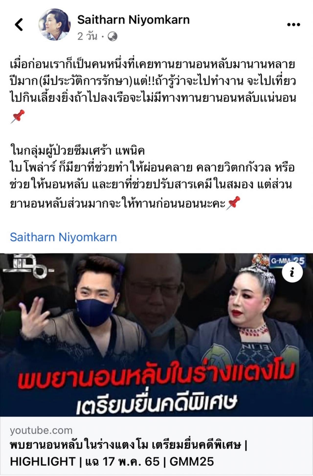 ยังคงเป็นประเด็นที่หลายคนสงสัยเกี่ยวกับการเสียชีวิตของนักแสดงสาว แตงโม ภัทรธิดา (นิดา) พัชรวีระพงษ์ ซึ่งคดีนี้เป็นคดีใหญ่ที่คนในประเทศต่างจับตามองกันอย่างมาก ล่าสุด ต่าย สายธาร ได้โพสต์ข้อความผ่านเฟซบุ๊กของตัวเอง ในประเด็นที่ได้มีการพบยานอนหลับอยู่ในร่างของ แตงโม ว่า
