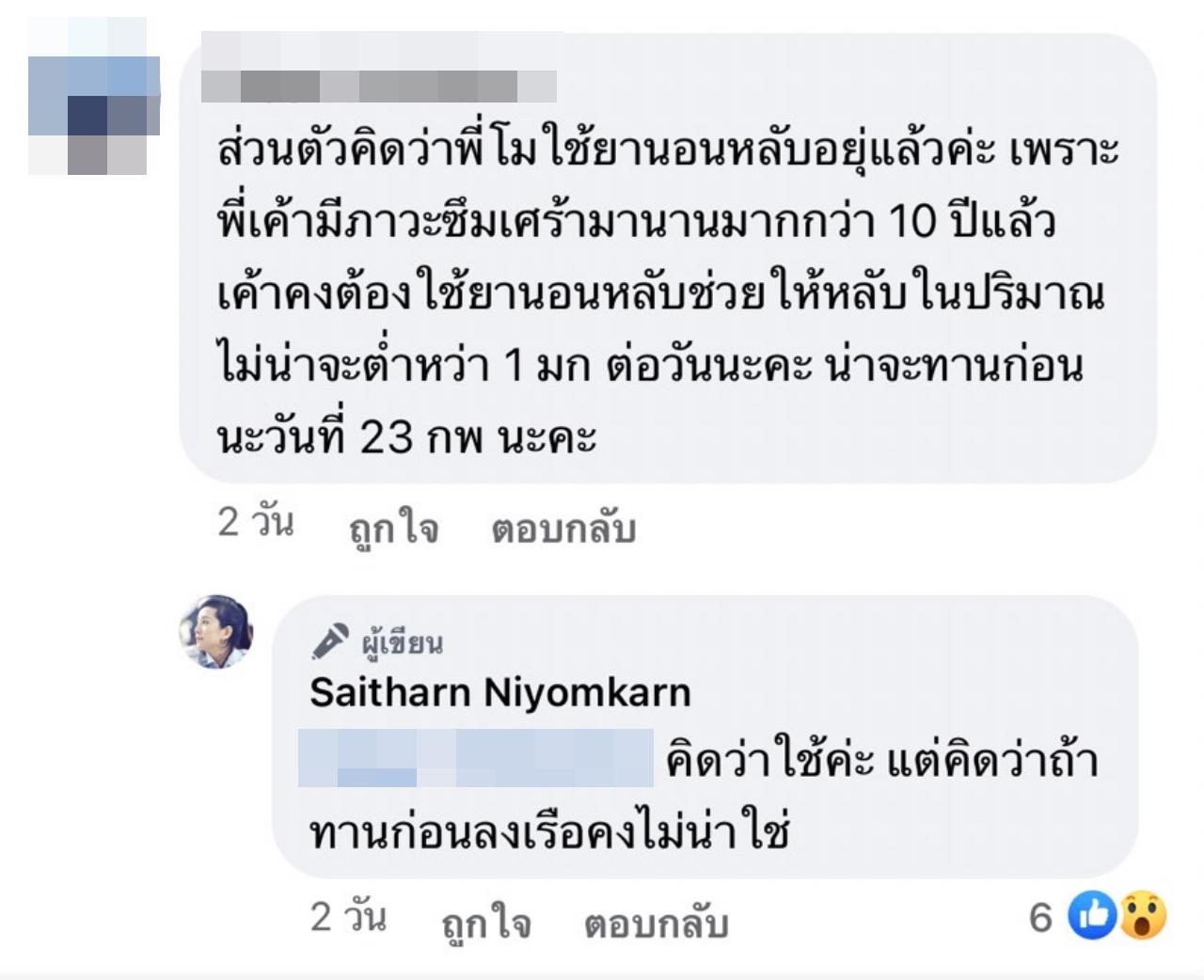 "เมื่อก่อนเราก็เป็นคนหนึ่งที่เคยทานยานอนหลับมานานหลายปีมาก(มีประวัติการรักษา) แต่!!ถ้ารู้ว่าจะไปทำงาน จะไปเที่ยวไปกินเลี้ยงยิ่งถ้าไปลงเรือจะไม่มีทางทานยานอนหลับเเน่นอน