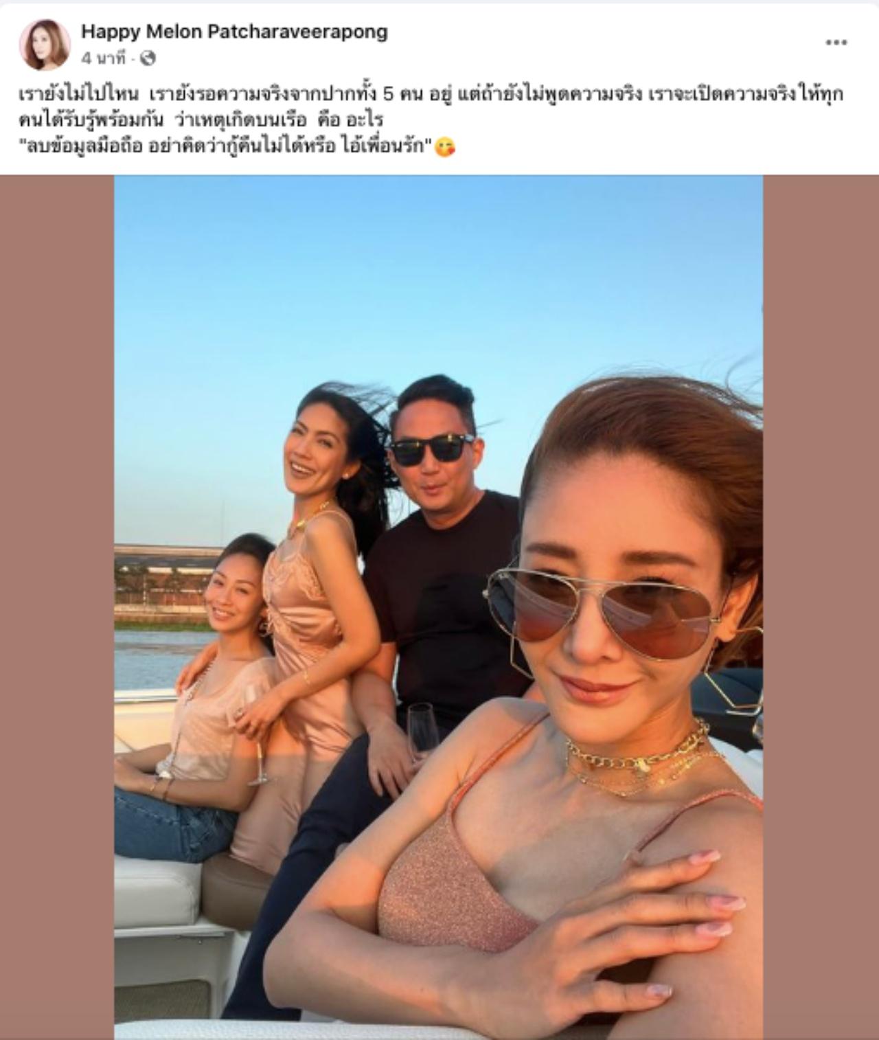 ยังเป็นที่ถกเถียงกันเมื่ออยู่ๆ เฟซบุ๊ก แตงโม นิดา Happy Melon Patcharaveerapong หลังมีโพสต์ปริศนาถูกเผยแพร่ผ่านเฟซบุ๊กส่วนตัว ของ แตงโม นิดา โดยโพสต์ภาพคนยืนหันหลังโบกมืออยู่บนหัวเรือสปีดโบ๊ตมีฉากหลังเป็นแม่น้ำเจ้าพระยา พร้อมข้อความ "หนูถูกทำร้ายจากเพื่อนที่เรารักแล้วไว้ใจ"