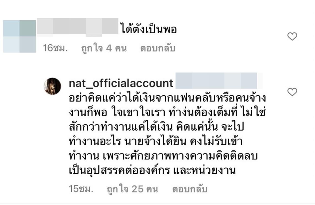 งานนี้ทำเอา แน๊ต เกศริน ต้องเข้ามาคอมเมนต์ตอบกลับที่อ่านแล้วต้องหน้าชาว่า "อย่าคิดแค่ว่าได้เงินจากแฟนคลับหรือคนจ้างงานก็พอ ใจเขาใจเรา ทำงานต้องเต็มที่