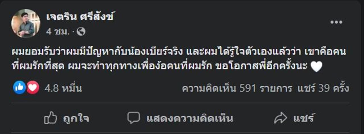 แต่ล่าสุด เนเงิน เจตริน ก็ได้โพสต์ข้อความผ่านทางเฟซบุ๊กของตัวเองว่า "ผมยอมรับว่าผมมีปัญหากับน้องเบียร์จริง และผมได้รู้ใจตัวเองแล้วว่า เขาคือคนที่ผมรักที่สุด ผมจะทำทุกทางเพื่อง้อคนที่ผมรัก ขอโอกาสพี่อีกครั้งนะ" พร้อมกับแคปภาพที่โทรหาครูเบียร์แต่อีกฝ่ายไม่รับสายให้ทุกคนเห็น