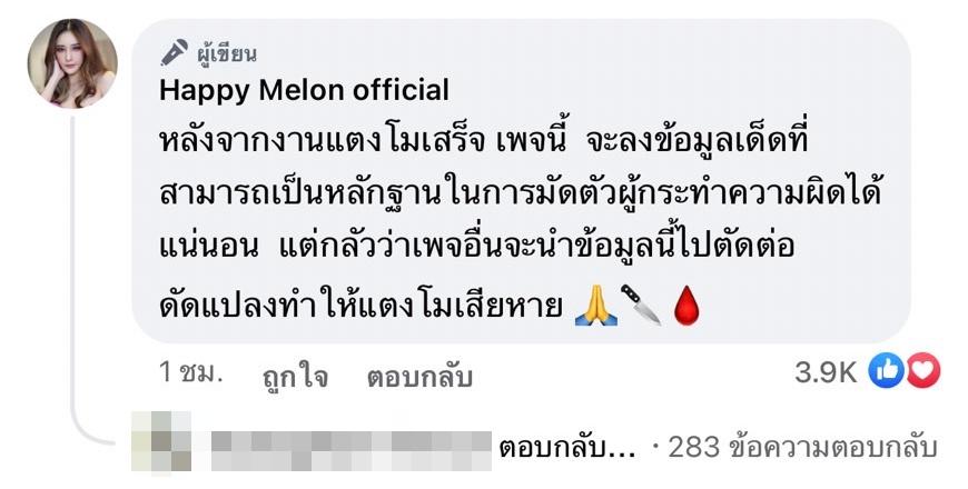 ก่อนจะทิ้งท้ายเพิ่มเติมผ่านทางคอมเมนต์ใต้โพสต์ดังกล่าวว่า “หลังจากงานแตงโมเสร็จ เพจนี้ จะลงข้อมูลเด็ดที่สามารถเป็นหลักฐานในการมัดตัวผู้กระทำความผิดได้แน่นอน แต่กลัวว่าเพจอื่นจะนำข้อมูลนี้ไปตัดต่อดัดแปลงทำให้แตงโมเสียหาย” โดยมีชาวเน็ตแสดงความคิดเห็นเป็นจำนวนมาก.