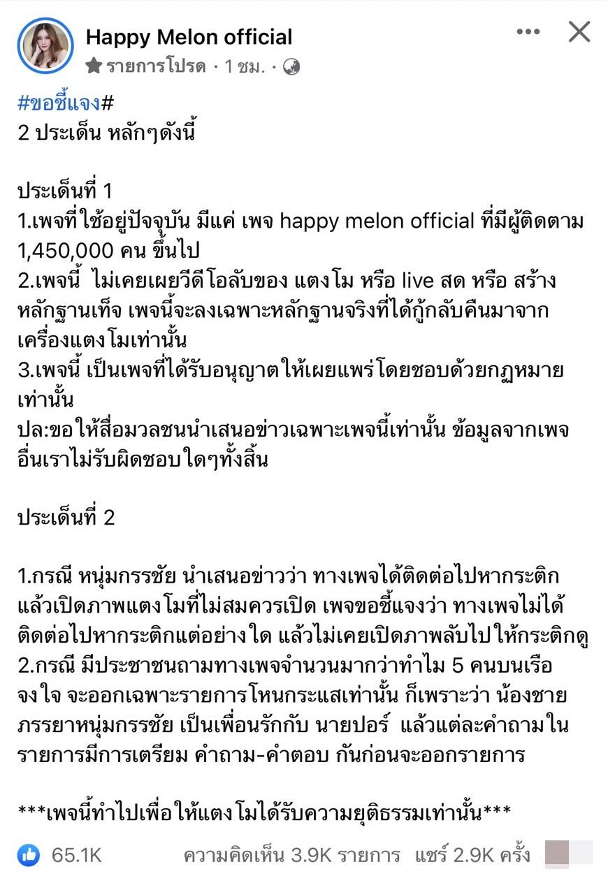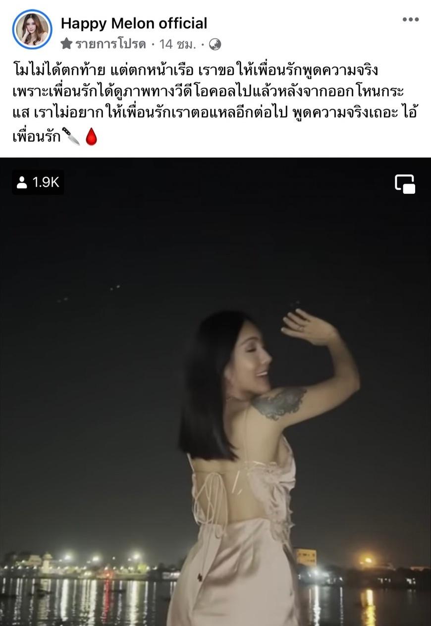 เป็นประเด็นร้อนต่อเนื่อง สำหรับเพจ Happy Melon official ซึ่งเป็นเพจที่มีมือปริศนารายหนึ่งโพสต์ภาพกับคลิปและข้อความเกี่ยวกับนักแสดงสาวผู้ล่วงลับ แตงโม นิดา พัชรวีระพงษ์ และคนบนเรืออีก 5 คน ซึ่งเป็นภาพและคลิปที่อ้างว่ามาจากโทรศัพท์มือถือของแตงโม