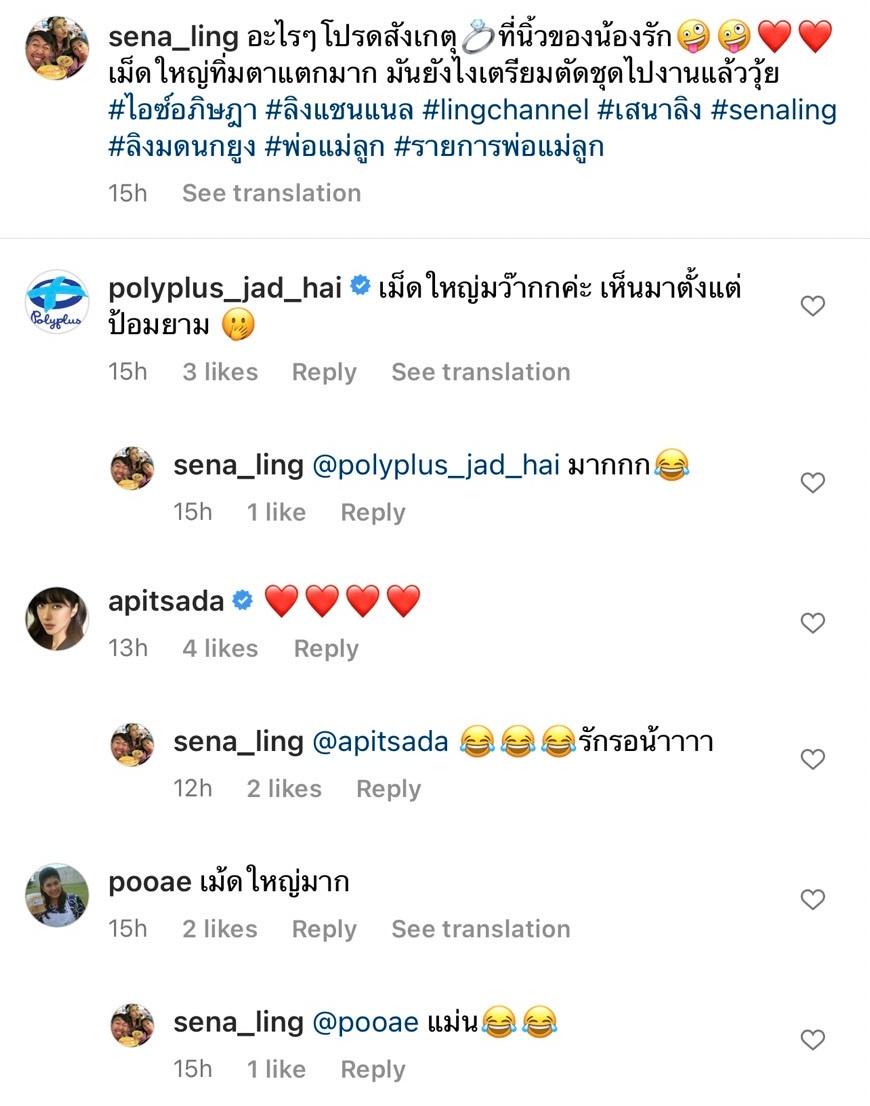 งานนี้ทำเอาแฟนๆ แห่คอมเมนต์แซวไอซ์ รวมไปถึงไอจีค่ายโพลีพลัส @polyplus_jad_hai ก็เข้ามาแซวว่า “เม็ดใหญ่มว๊ากกค่ะ เห็นมาตั้งแต่ป้อมยาม” ด้านไอซ์ก็เข้ามาคอมเมนต์เป็นอีโมจิรูปหัวใจ ซึ่งเสนาลิงก็ตอบกลับเป็นอีโมจิขำน้ำตาไหลและเขียนข้อความว่า “รักรอน้าาาา”