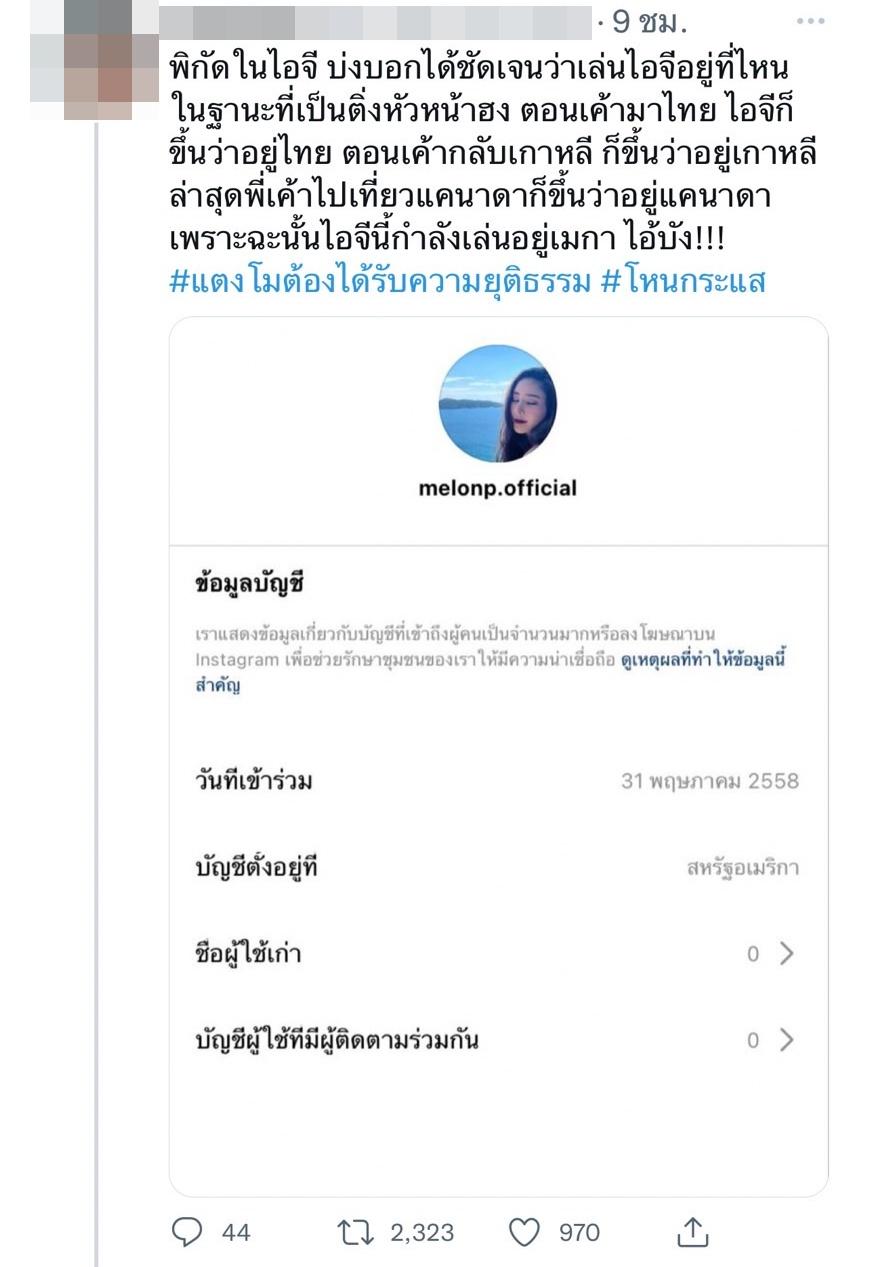 ล่าสุดก็มีกระแสร้อนในโลกออนไลน์ เมื่อมีชาวเน็ตตั้งข้อสังเกตว่าไอจีส่วนตัวของแตงโมขึ้นข้อความว่าบัญชีอยู่ในสหรัฐอเมริกา และบอกว่าพิกัดในไอจี บ่งบอกได้ชัดเจนว่าเล่นไอจีอยู่ที่ไหน พร้อมทั้งยกตัวอย่าง คิมซอนโฮ พระเอกหนุ่มชาวเกาหลีใต้ โดยบอกว่าตอนที่พระเอกดังมาเมืองไทย ไอจีก็ขึ้นว่าอยู่ที่ไทย พอกลับเกาหลีก็ขึ้นว่าอยู่เกาหลี ล่าสุดไปเที่ยวแคนาดา ก็ขึ้นว่าอยู่แคนาดา เพราะฉะนั้นไอจีของแตงโมน่าจะกำลังเล่นอยู่ที่อเมริกา โดยมีการรีทวีตและแสดงความคิดเห็นเป็นจำนวนมาก.