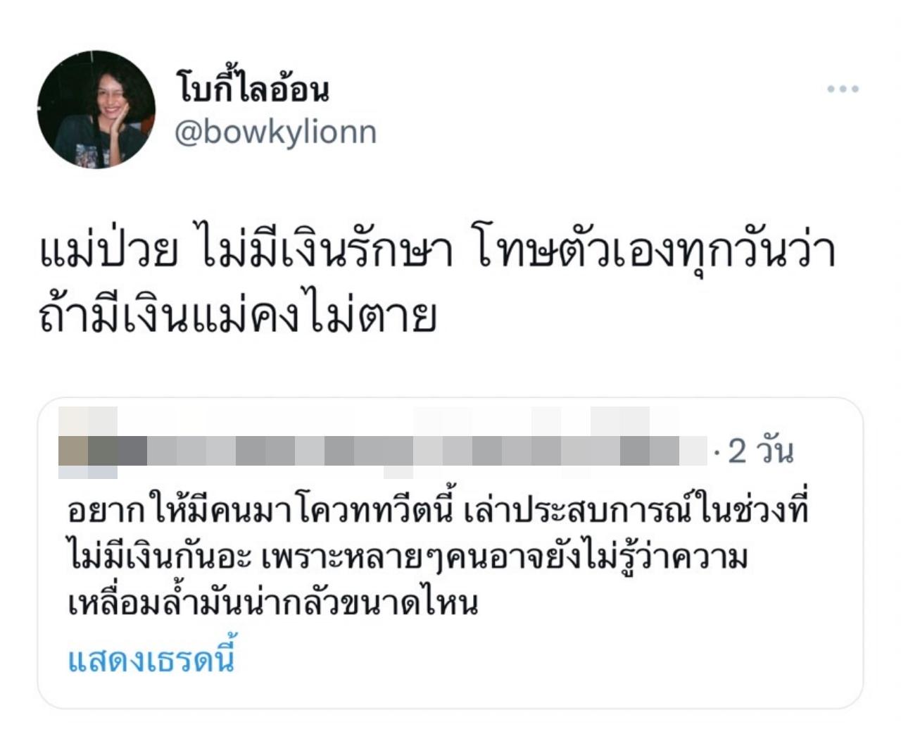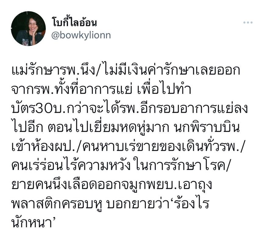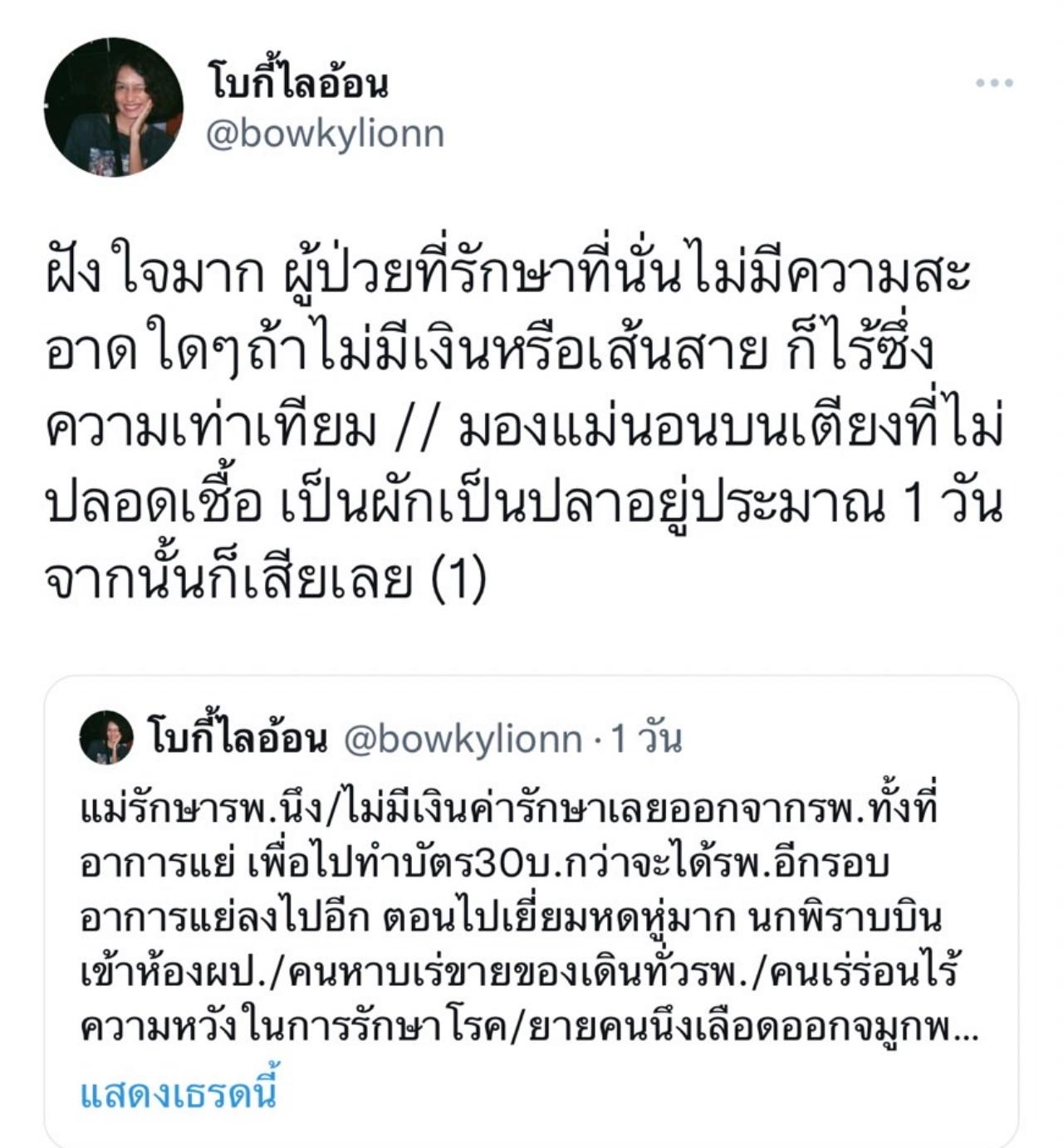 โดย โบกี้ ได้ทวีตข้อความว่า "แม่ป่วย ไม่มีเงินรักษา โทษตัวเองทุกวันว่าถ้ามีเงินแม่คงไม่ตาย" จากนั้นก็ได้เล่าต่อว่า "แม่รักษารพ.นึง/ไม่มีเงินค่ารักษา เลยออกจากรพ.ทั้งที่อาการแย่ เพื่อไปทำบัตร30บ. กว่าจะได้รพ.อีกรอบอาการแย่ลงไปอีก ตอนไปเยี่ยมหดหู่มาก นกพิราบบินเข้าห้องผป./คนหาบเร่ขายของเดินทั่วรพ./คนเร่ร่อนไร้ความหวังในการรักษาโรค/ยายคนนึงเลือดออกจมูก พยบ.เอาถุงพลาสติกครอบหู บอกยายว่า ‘ร้องไรนักหนา’