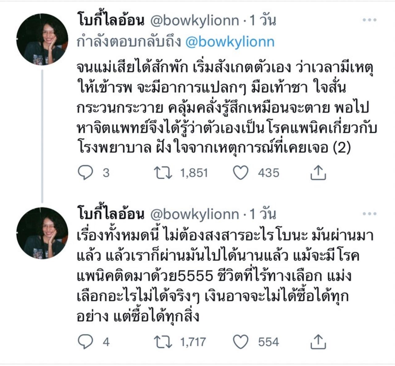 เรื่องทั้งหมดนี้ ไม่ต้องสงสารอะไรโบนะ มันผ่านมาแล้ว แล้วเราก็ผ่านมันไปได้นานแล้ว แม้จะมีโรคแพนิกติดมาด้วย5555 ชีวิตที่ไร้ทางเลือก แม่งเลือกอะไรไม่ได้จริงๆ เงินอาจจะไม่ได้ซื้อได้ทุกอย่าง แต่ซื้อได้ทุกสิ่ง"