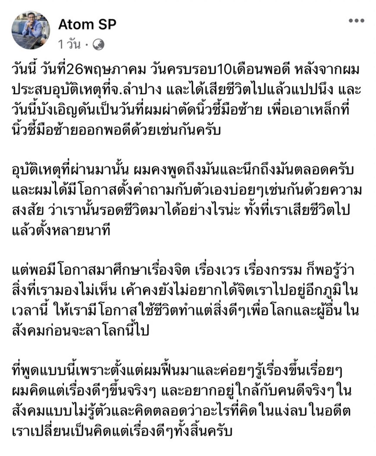 มาวันนี้ครบ 10 เดือนแล้วหลังจากเกิดเหตุใหญ่ในชีวิต อะตอม ก็ได้เขียนโพสต์ถึงอุบัติเหตุในวันนั้น ที่เกือบเสียชีวิตไปแล้ว จากเหตุการณ์ในครั้งนั้น ทำให้เจ้าตัวได้เปลี่ยนความคิดใหม่ทั้งหมด และเปลี่ยนวิธีการใช้ชีวิตอีกด้วย
