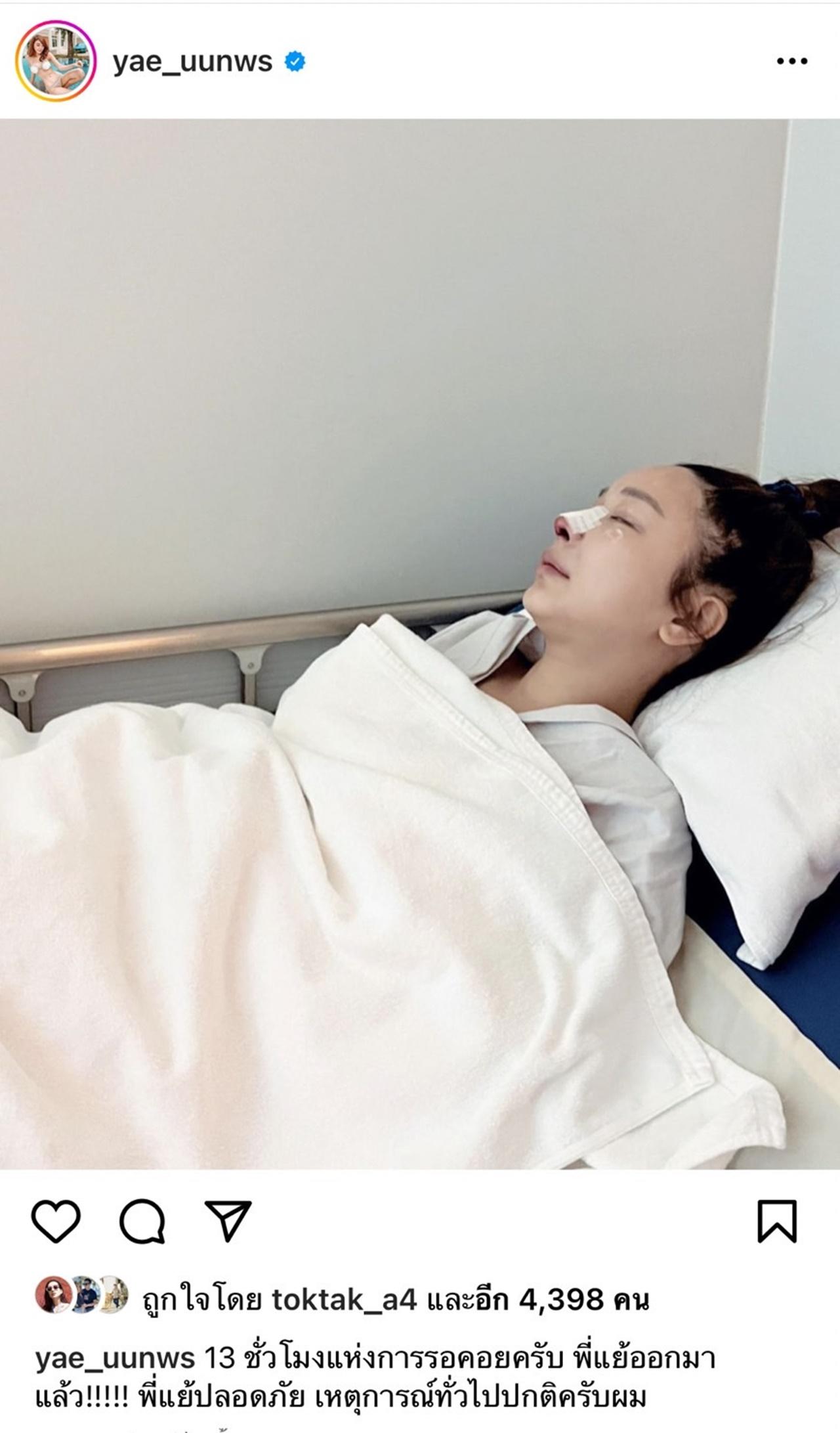ส่วนอาการ เจ็บทั้ง 2 ที่คือทั้งที่จมูกและแผลที่ผ่าซี่โครง ตอนนี้พี่แย้ยังไม่ได้สติ100% ครับเลยยังไม่ได้จับมือถือ แต่สามารถติดต่อมาได้ปกติครับ @rakhom_k จะเป็นคนรับสายและอ่านไลน์ ขอกำลังใจให้พี่แย้ด้วยนะครับ".