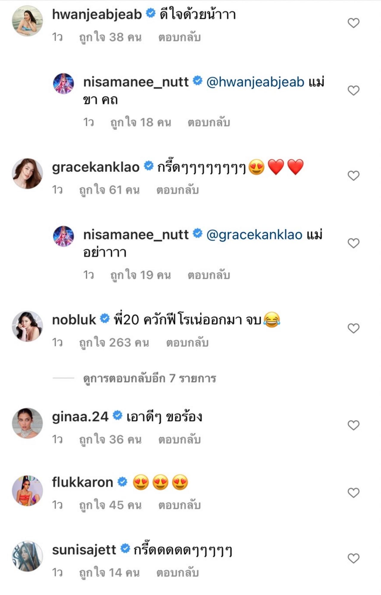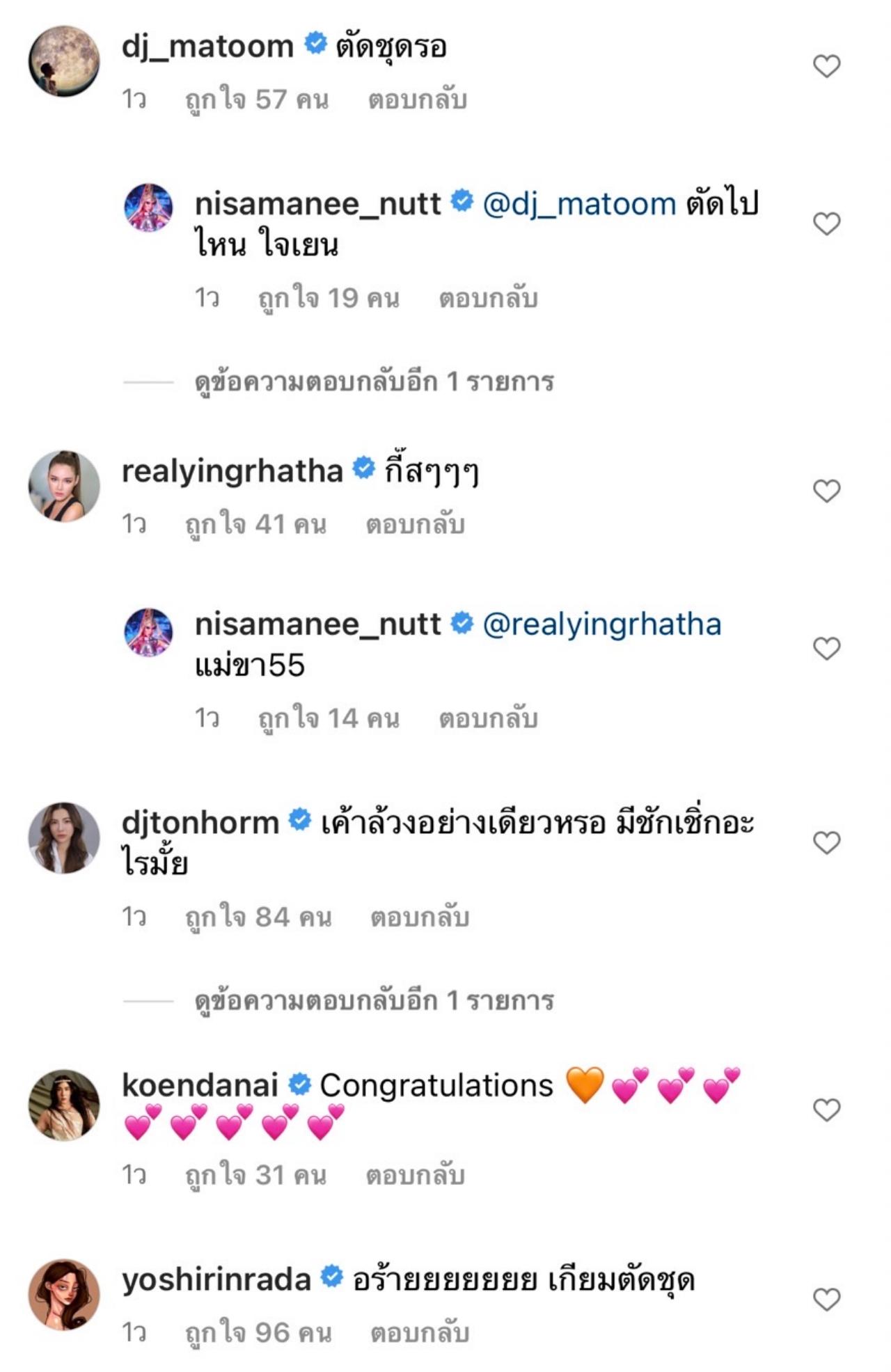 ด้านเพื่อนดาราในวงการบันเทิง รวมไปถึงแฟนคลับที่ติดตามต่างเข้ามาร่วมแสดงความยินดีกันเป็นจำนวนมาก อาทิ ดีเจมะตูม, หญิง รฐา, ดีเจต้นหอม, เกรซ กาญจน์เกล้า, วิกกี้ สุนิสา, จีน่า เดอะเฟซ เป็นต้น.