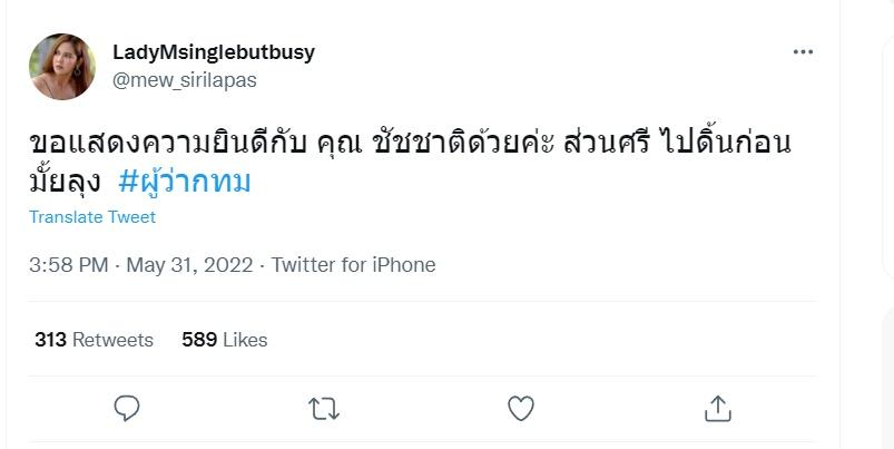 หมิว สิริลภัส ทวีตข้อความในทวิตเตอร์ “ขอแสดงความยินดีกับคุณชัชชาติด้วยค่ะ ส่วนศรี ไปดิ้นก่อนมั้ยลุง #ผู้ว่ากทม”.