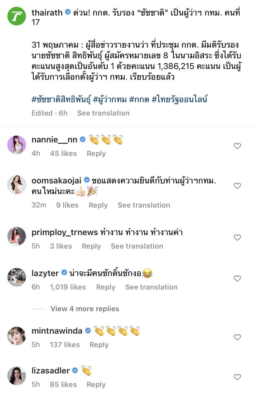 หลังจากที่ประชุม กกต. มีมติรับรอง นายชัชชาติ สิทธิพันธุ์ ผู้สมัครหมายเลข 8 ในนามอิสระ ซึ่งได้รับคะแนนสูงสุดเป็นอันดับ 1 ด้วยคะแนน 1,386,215 คะแนน เป็นผู้ได้รับการเลือกตั้งผู้ว่าฯ กทม. คนที่ 17 เรียบร้อยแล้ว โดยมีชาวเน็ตเข้ามาคอมเมนต์แสดงความยินดีกับผู้ว่าฯ กทม.คนใหม่เป็นจำนวนมาก