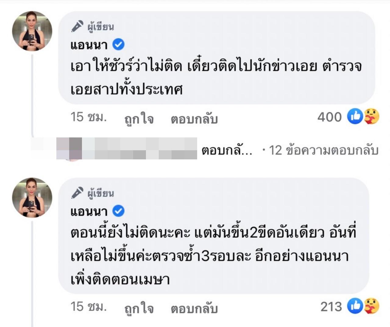 ซึ่ง แอนนา ก็ได้มาคอมเมนต์ตอบเพิ่มใต้ข้อความว่า "เอาให้ชัวร์ว่าไม่ติด เดี๋ยวติดไปนักข่าวเอย ตำรวจเอยสาปทั้งประเทศ, ตอนนี้ยังไม่ติดนะคะ แต่มันขึ้น 2 ขีดอันเดียว อันที่เหลือไม่ขึ้นค่ะตรวจซ้ำ 3 รอบละ อีกอย่างแอนนาเพิ่งติดตอนเมษา, กำลังไปตรวจค่ะ รอผล 24 ชม. ค่ะ จริงๆ กลับได้เลย บ้านเราไม่เอาผลแล้วแต่กลัวถ้าติดจริงทัวร์ลงอีก เลยเอาให้ชัวร์, พระศุกร์เข้าพระเสาร์แทรกมาก".