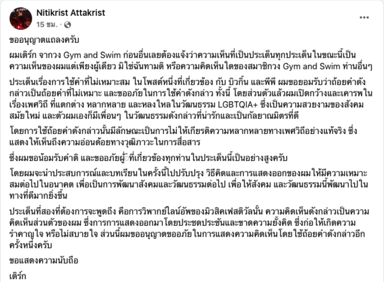 "ขออนุญาตแถลงครับ ผมเติร์ก จากวง Gym and Swim ก่อนอื่นเลยต้องแจ้งว่าความเห็นที่เป็นประเด็นทุกประเด็นในขณะนี้เป็นความเห็นของผมแต่เพียงผู้เดียว มิใช่ฉันทามติ หรือความคิดเห็นใดของสมาชิกวง Gym and Swim ท่านอื่นๆ