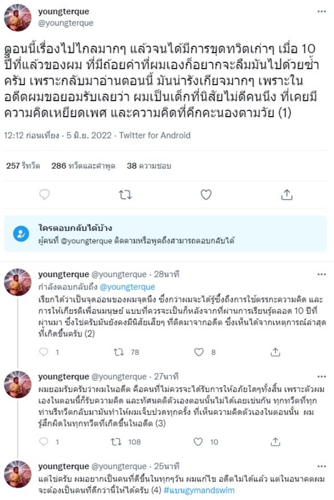 ผมยอมรับครับว่าผมในอดีต คือคนที่ไม่ควรจะได้รับการให้อภัยใดๆ ทั้งสิ้น เพราะตัวผมเองในตอนนี้ก็รับความคิด และทัศนคติตัวเองตอนนั้นไม่ได้เลยเช่นกัน ทุกทวีตที่ทุกท่านรีทวีตกลับมามันทำให้ผมเจ็บปวดทุกครั้ง ที่เห็นความคิดตัวเองในตอนนั้น ผมรู้สึกผิดในทุกทวีตที่เกิดขึ้นในอดีต แต่ใช่ครับ ผมอยากเป็นคนที่ดีขึ้นในทุกๆ วัน ผมแก้ไข อดีตไม่ได้แล้ว แต่ในอนาคตผมจะต้องเป็นคนที่ดีกว่านี้ให้ได้ครับ".