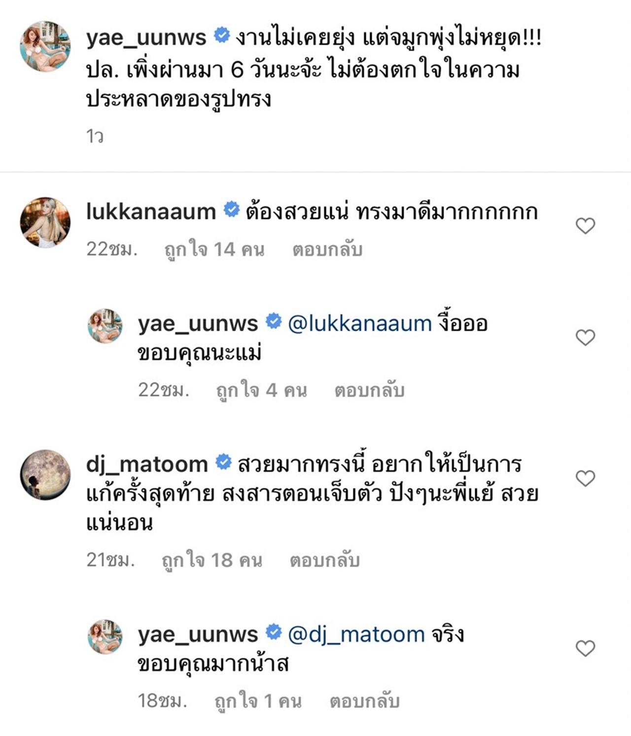 ด้านเพื่อนๆ ที่ติดตามก็ได้เข้ามาคอมเมนต์ว่า ต้องสวยแน่ ทรงมาดีมากกกกกก, สวยมากทรงนี้ อยากให้เป็นการแก้ครั้งสุดท้าย สงสารตอนเจ็บตัว ปังๆนะพี่แย้ สวยแน่นอน, เย้ยยยยย เห็นได้ถึงความปัง!!!, ดีย์มากกก.