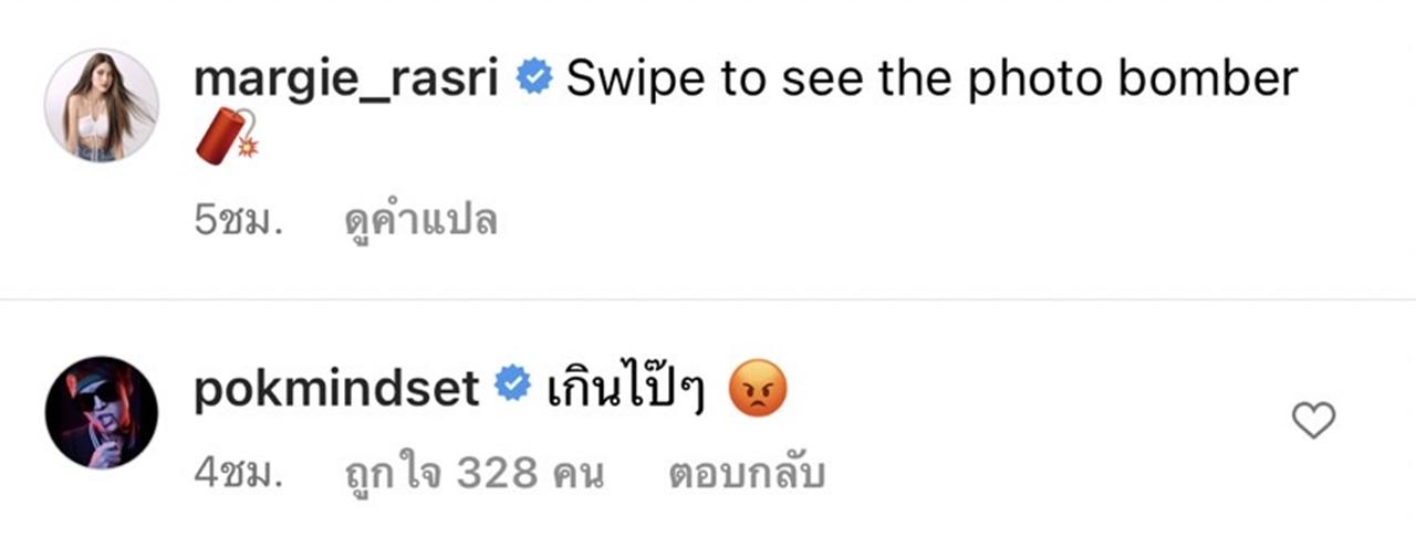 และเพิ่มความเซ็กซี่ขึ้นไปอีกโดยการถ่ายเสยและถ่ายตรงๆ จนหลายคนชมไม่ขาดสาย แม้แสงแดดจะร้อนจัด แต่ไม่สามารถต้านทานความร้อนแรงของมาร์กี้ได้ พร้อมกับแคปชั่นว่า "Swipe to see the photo bomber" งานนี้ ป๊อก ก็ได้รีบเข้ามาคอมเมนต์ว่า "เกินไป๊ๆ" แถมยังใส่อีโมจิหน้ารูปโกรธอีกด้วย.