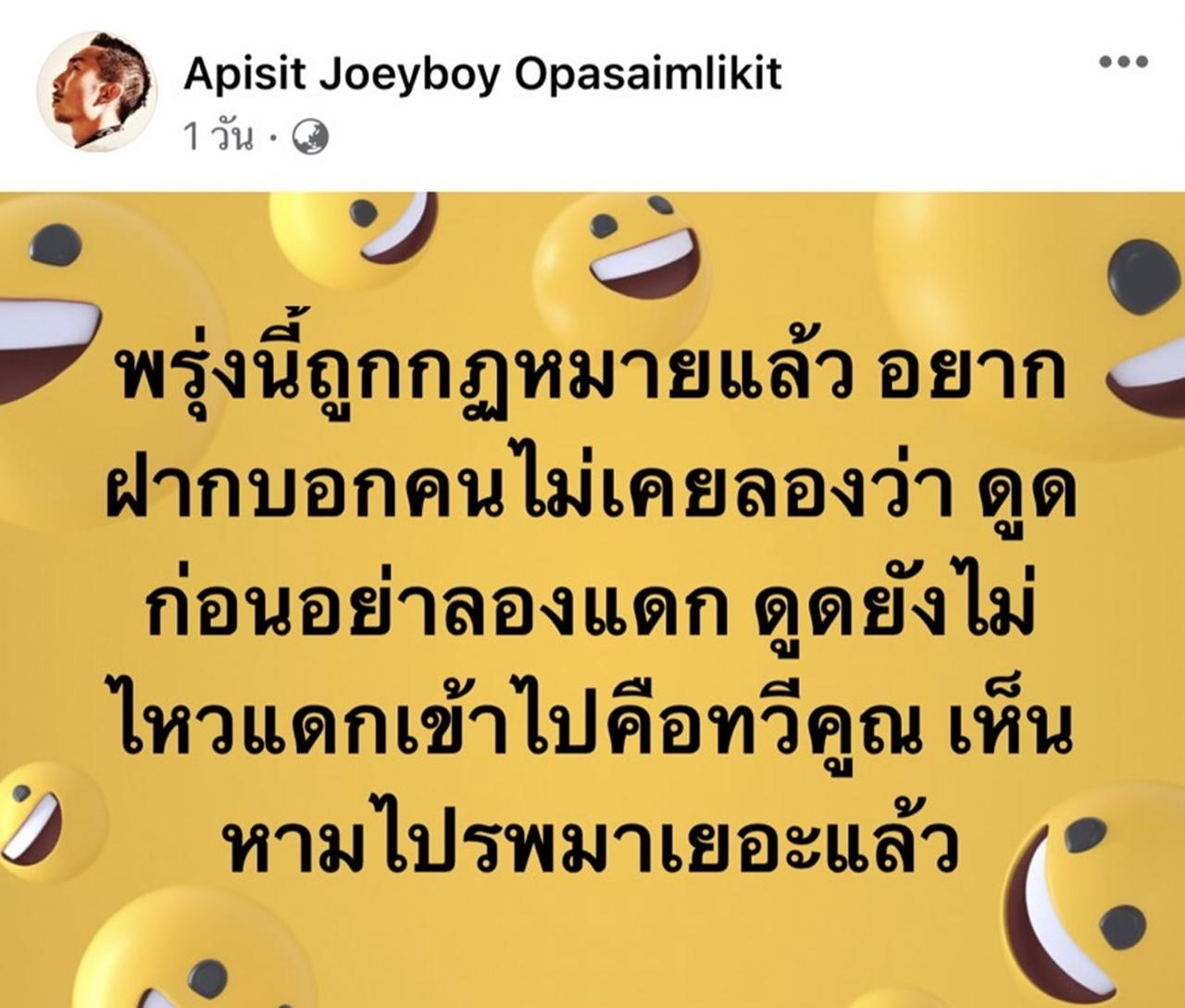 ด้านแร็ปเปอร์ชื่อดัง โจอี้ บอย ก็ได้โพสต์ถึงประเด็นนี้ผ่านทางเฟซบุ๊กของตัวเอง พร้อมกับฝากเตือนถึงคนที่ไม่เคยลองกัญชาแต่อยากลอง ถ้าไม่ไหวก็อย่าฝืน เพราะเห็นโดนหามส่งโรงพยาบาลกันมาเยอะแล้ว