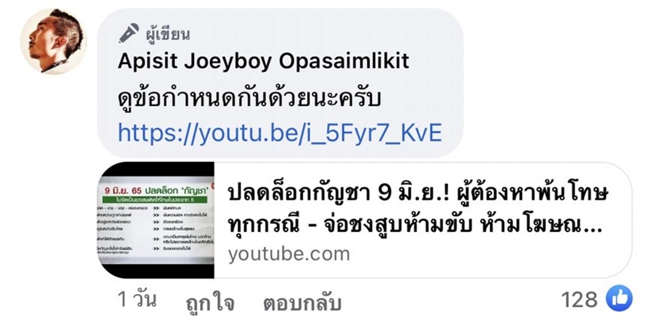 จากนั้นก็ได้เขียนต่อในช่องคอมเมนต์ว่า "ที่บอกไม่ได้ชวนให้ลองดูด เปรียบเทียบให้ฟังเฉยๆ การแดกที่ไม่ได้ใช้ส่วนดอกก็ไม่ทำให้เกิดอาการเมา แต่แอบห่วงบางคนที่คิดจะลองแล้วเผลอไปเจอกับอาหาร หรือขนมหวานที่ผสมดอกของมันเข้าไป แล้วคิดว่าลองกินดูหน่อยซิ๊ใสๆ หรือแม้กระทั่งเอาให้คนแก่หยดแบบมีthc หยดเกินไปก็ยาวได้"