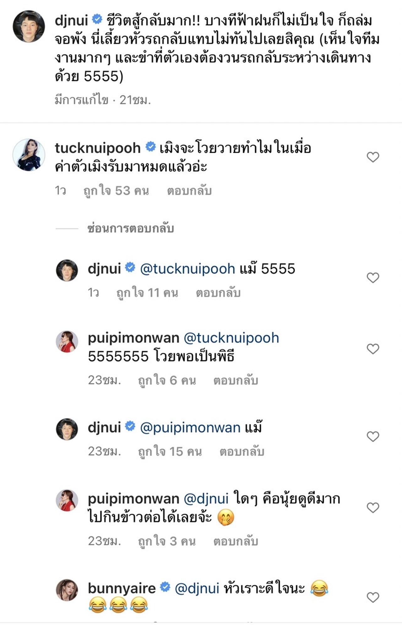งานนี้พี่สาวสุดที่รักอย่าง ตั๊ก ศิริพร ก็อดไม่ได้ที่จะเข้ามาคอมเมนต์ทักหาน้องรัก โดยบอกว่า "เมิงจะโวยวายทำไมในเมื่อค่าตัวเมิงรับมาหมดแล้วอ่ะ" ด้าน ดีเจนุ้ย รีบตอบกลับทันทีว่า "แม๊ 5555" ด้าน ปุ้ย พรพิมล ก็พีกไม่แพ้กัน ได้เข้ามาทัก ดีเจนุ้ย เช่นกันว่า "5555555 โวยพอเป็นพิธี".