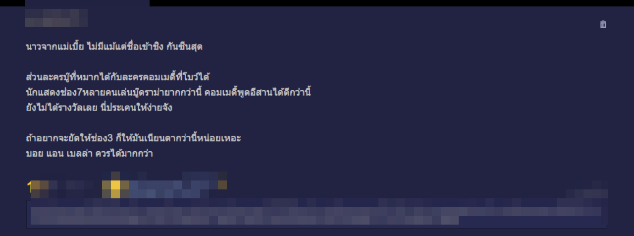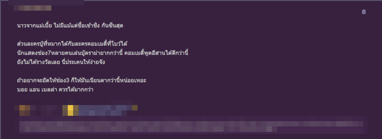 นอกจากนี้ ชาวเน็ตยังได้คอมเมนต์แสดงความคิดเห็นต่ออีกว่า พอมาเป็นนักแสดงของช่อง 3 ก็ได้มีชื่อเข้าชิงรางวัลและคว้ารางวัลปาดหน้าคนอื่นที่ได้บทที่ยากกว่าอีกด้วย ถ้าอยากจะให้รางวัล ช่อง 3 ควรทำให้มันเนียนกว่านี้หน่อย